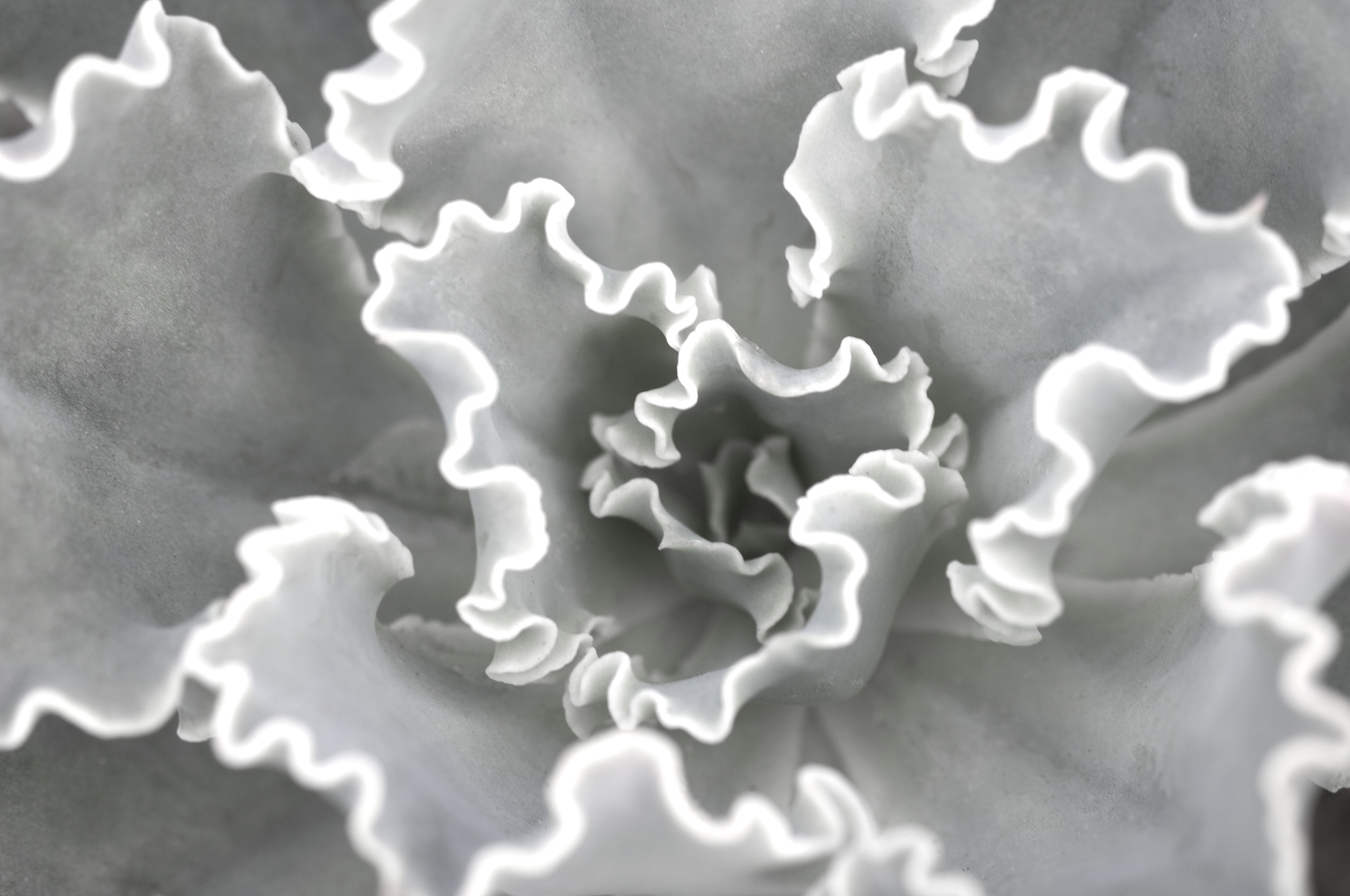 This striking close-up image captures the delicate and intricate beauty of a pale, almost ethereal succulent. Each petal unfurls with an elegant ripple, its edges softly outlined in white, creating a mesmerizing pattern of undulating forms that radiate from the center in a spiral formation. The subtle gradient of muted, silvery-gray hues imparts a sense of quiet grace and serenity, while the soft focus around the periphery draws the eye inward, inviting contemplation.