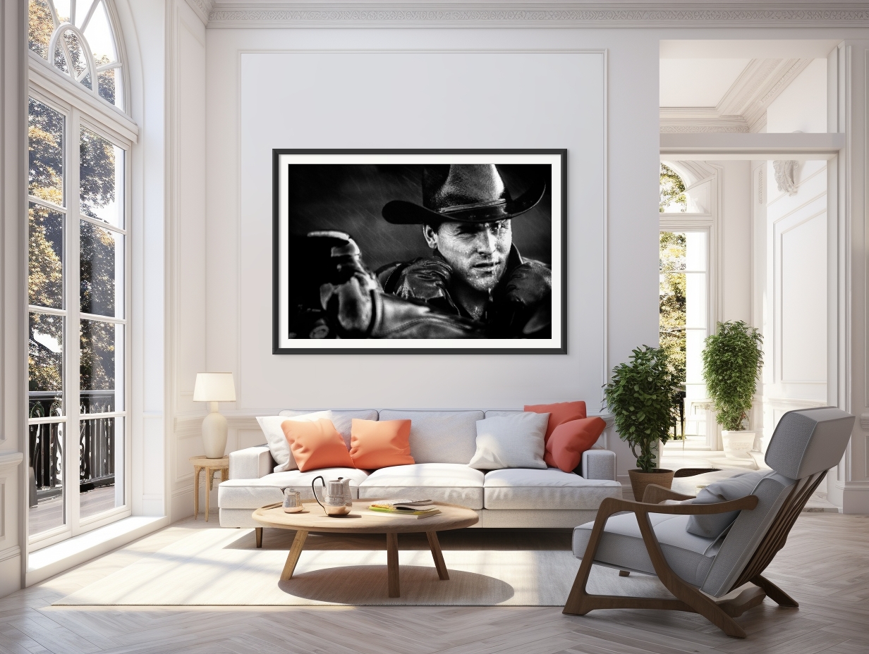 The composition's depth of field and tonal range underscore the artist’s mastery in using photography as a medium to explore themes of human endurance, rugged individualism, and the romanticized yet raw reality of the cowboy archetype. This image acts as both a homage to the tenacity of rural life and an intimate study of strength under pressure.