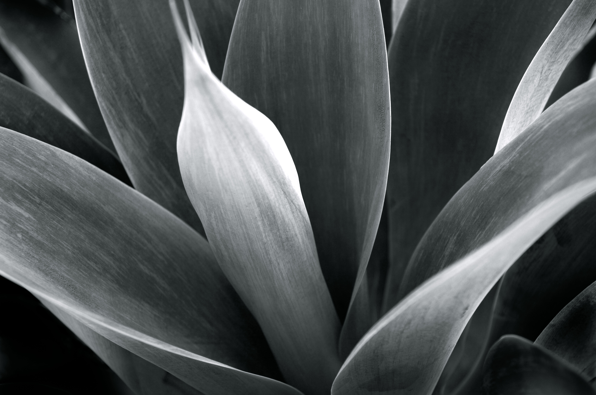 This monochromatic close-up photograph provides an intimate exploration of natural form, focusing on the smooth, overlapping leaves of a succulent plant. The composition emphasizes the elegant curvature and textural nuances of each leaf, capturing subtle gradations of light and shadow that enhance their organic structure. The image’s monochrome palette strips away the distraction of color, inviting viewers to appreciate the delicate interplay of shapes, lines, and tonal contrasts that create a sense of depth and movement. This work stands as a striking study in abstraction through nature, where botanical elements are transformed into an almost sculptural visual experience. The artist’s meticulous attention to detail and composition lends a meditative quality to the piece, evoking themes of growth, resilience, and the inherent beauty found within natural simplicity.