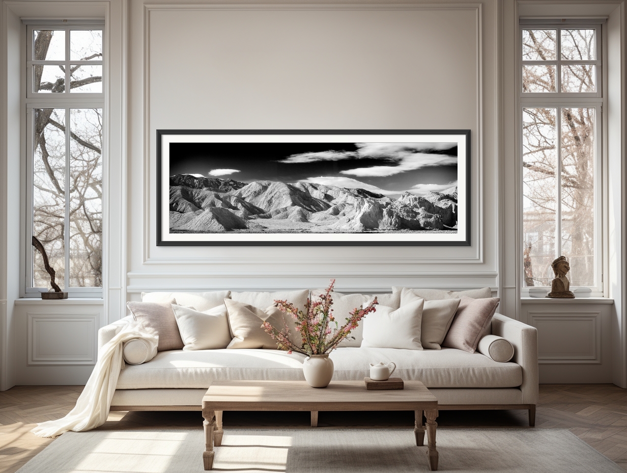 This striking black-and-white panoramic photograph captures a vast and stark desert mountain landscape with an emphasis on texture, light, and shadow. The foreground is dominated by rugged, eroded hills composed of rough, craggy rock formations, their surfaces marked by intricate grooves and subtle variations in tone. The natural undulations and folds of the terrain create an almost sculptural effect, inviting the viewer to explore the details of nature’s raw handiwork.