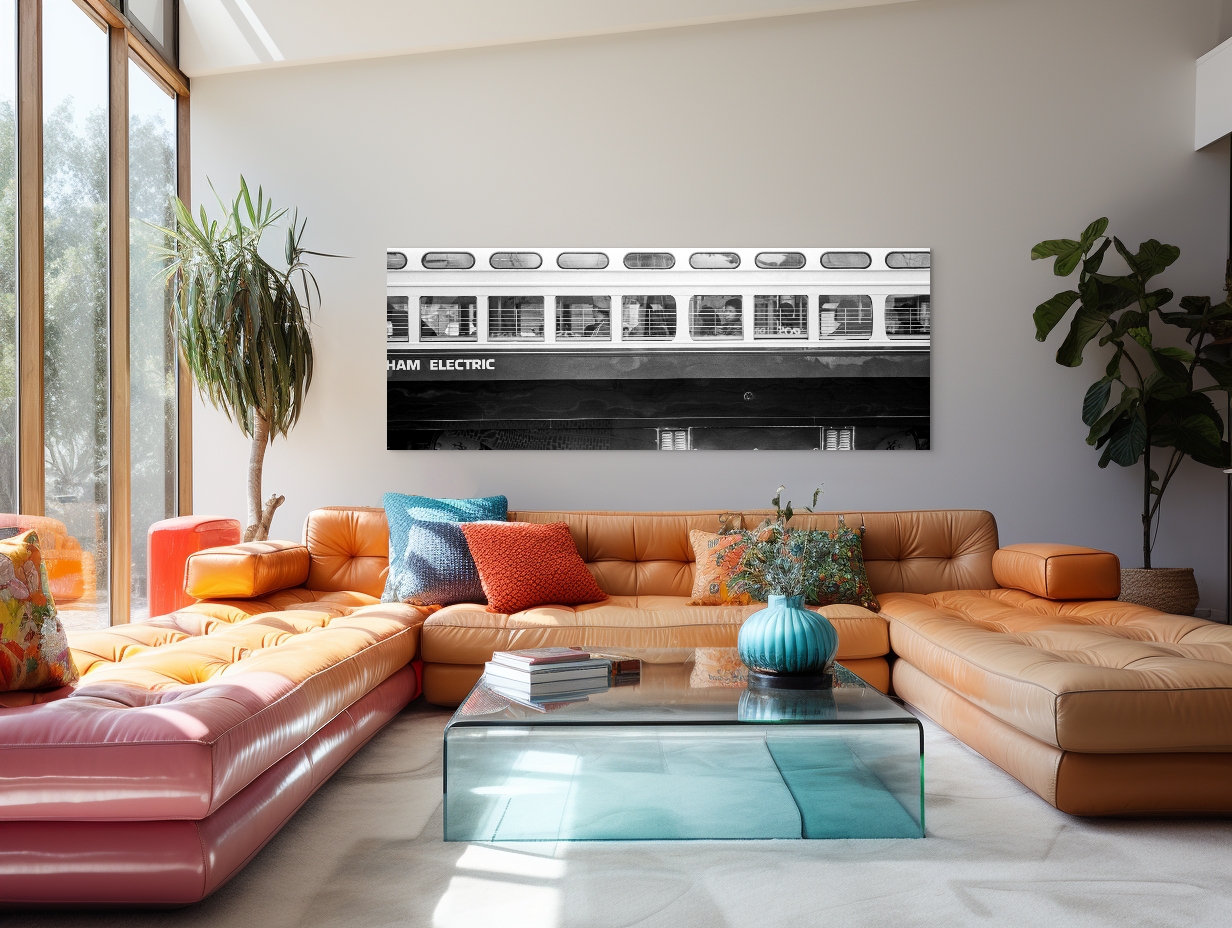 The vehicle itself appears to be vintage, distinguished by its rounded rectangular upper windows and slightly curved lower windows, each section framed in a light color contrasting with the darker body of the tram. Horizontal bars across the larger windows add an element of texture and a subtle barrier between the viewer and the individuals inside.