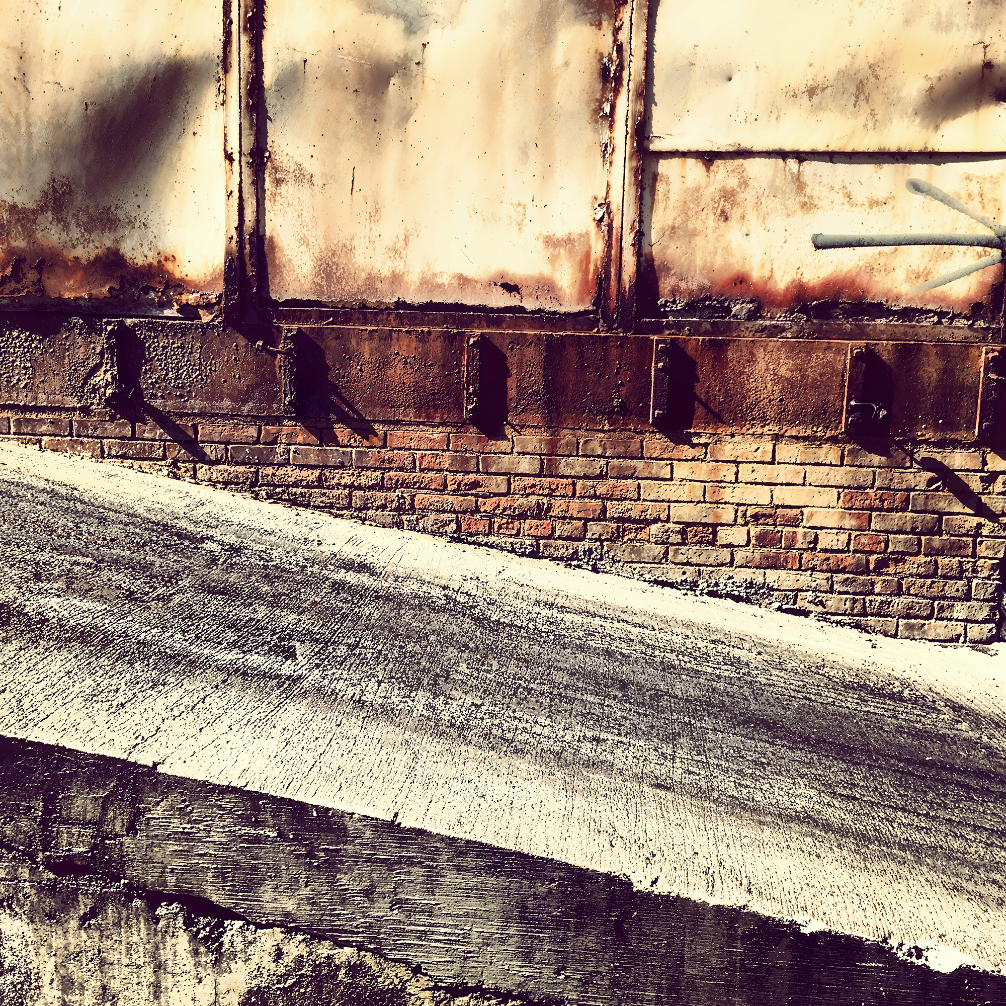 Beneath the metal panels lies a section of aged brickwork, its red and orange bricks laid in traditional horizontal courses. The brick reveals signs of wear, with some areas darkened by grime and others subtly cracked, yet it remains deeply rooted in solidity. This middle ground acts as a transitional zone between the deteriorating metal above and the rough concrete surface below.