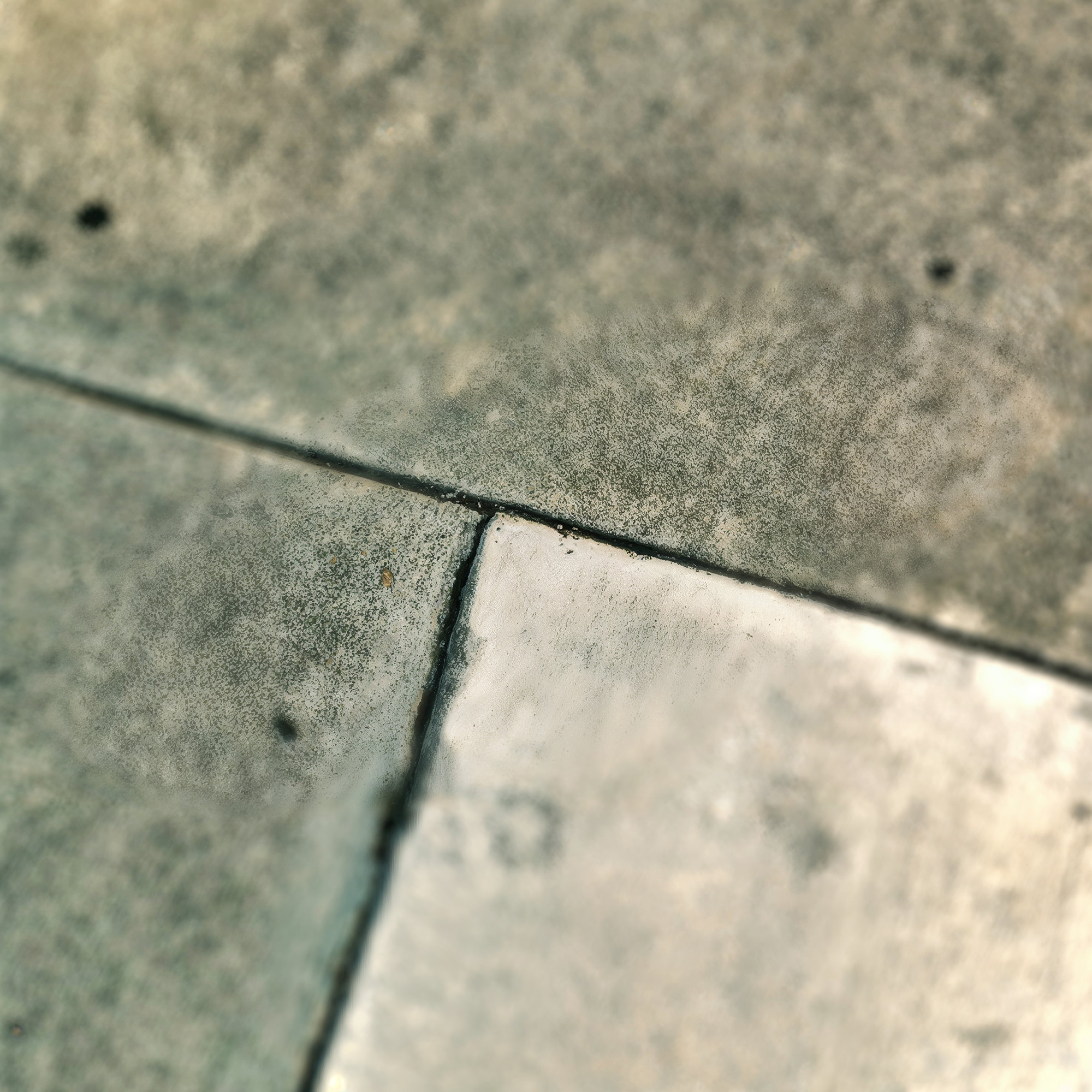 "Intersections in Grey" presents a captivating close-up view of a concrete pavement, capturing the intersection of architectural utility and natural texture. The photograph focuses on the seam where two slabs of concrete meet. Soft hues of gray and beige dominate the piece, highlighting subtle variations and textures unique to weathered stone surfaces.