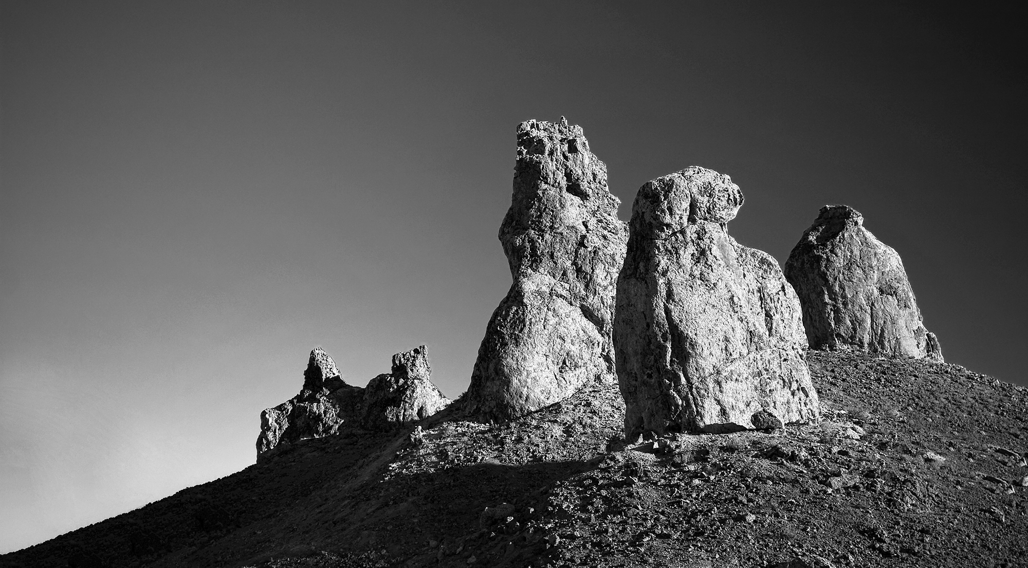 This black and white photograph captures a group of towering rock formations situated on a barren ridge, reminiscent of ancient sentinels standing guard over a desolate landscape. The jagged silhouettes of the rocks rise dramatically against a stark sky, their textured surfaces rendered with rich detail through the interplay of light and shadow. The absence of color emphasizes the rugged, raw nature of the terrain, enhancing the timeless and monumental quality of the scene. The arrangement of the formations, each unique in shape yet collectively commanding, evokes a profound sense of natural endurance and silent witness to the passage of geological epochs. The minimalist composition directs the viewer's focus to the sublime interplay between form, texture, and light, inviting contemplation of nature’s sculptural artistry in its purest form. This work eloquently bridges the realms of natural history and fine art, encapsulating the mysterious grandeur of the earth’s geological heritage.
