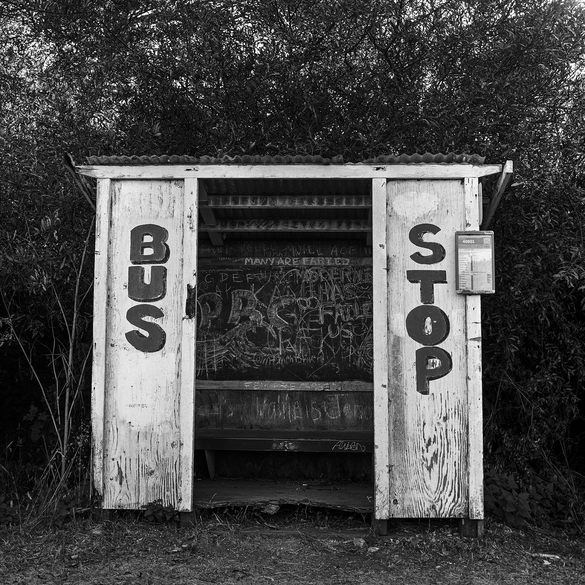This evocative black and white photograph captures a rustic bus stop, imbued with a sense of nostalgia and abandonment. The image features a small wooden shelter with weathered, corrugated metal roofing, surrounded by lush foliage that hints at its rural setting.