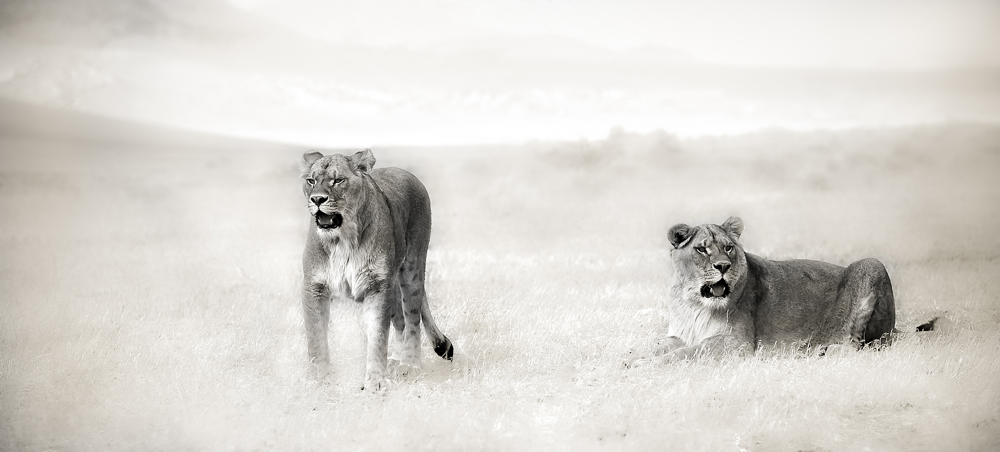 By tempering drama with restraint, the image transforms a moment of wildlife encounter into a meditation on presence and power. The lions are depicted not as spectacle, but as dignified inhabitants of a vast, hushed space, evoking both the fragility and the enduring authority of life within the open plain.