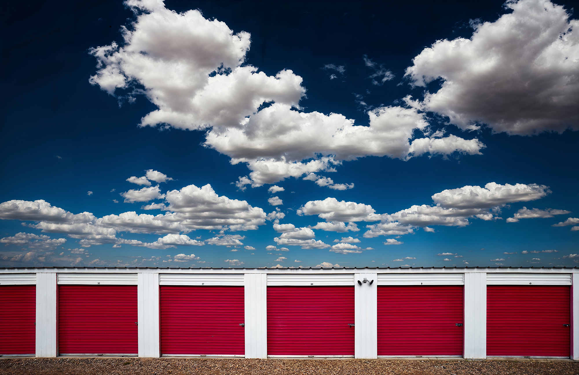 In striking contrast to the sky's organic fluidity, the lower portion of the image features a row of storage unit doors, brightly painted in a bold red. These doors, punctuated by vertical white dividers, introduce a rhythmic pattern, adding a layer of human-made regularity against the organic forms above. The coarse texture of the gravel in the foreground complements the industrial theme.