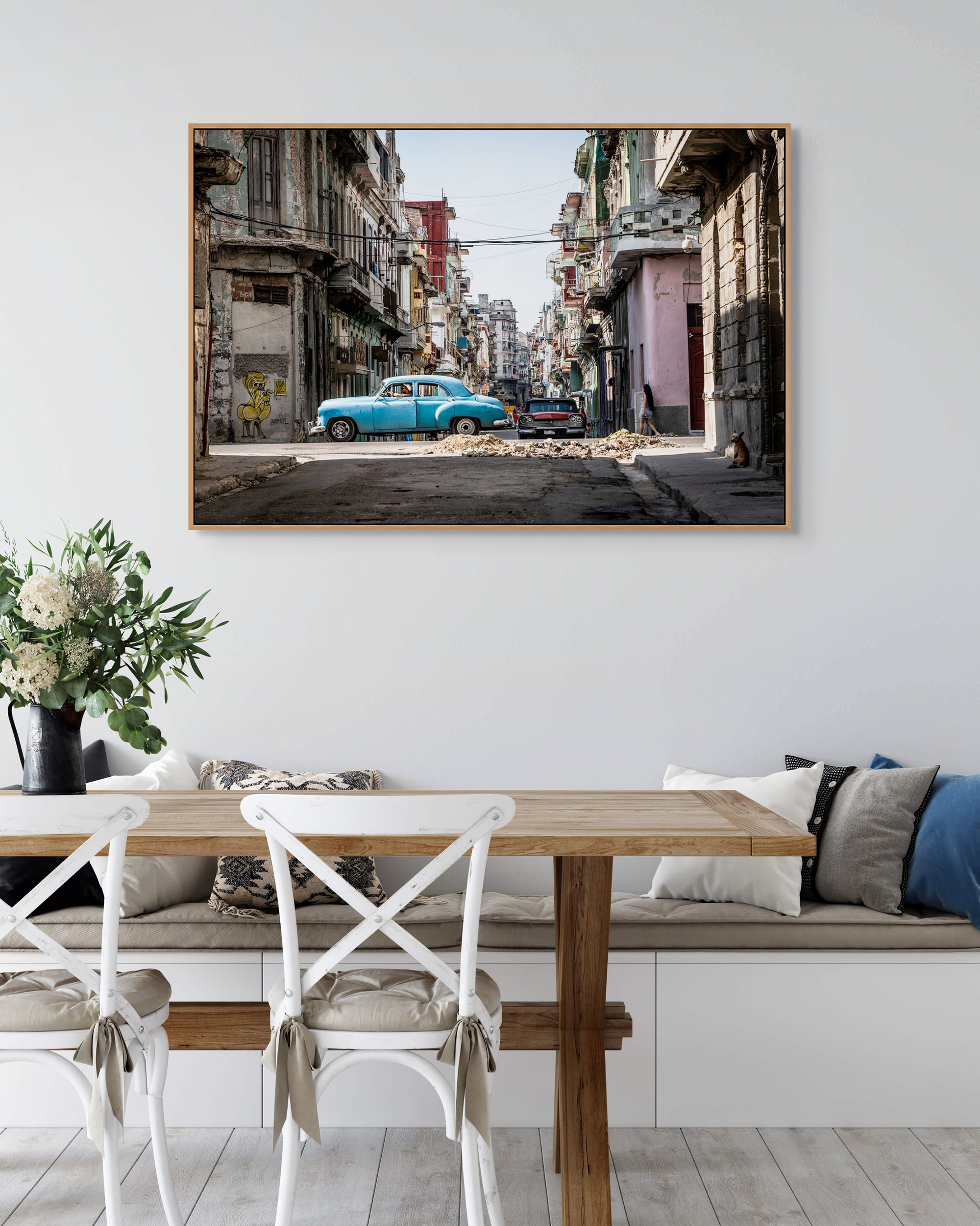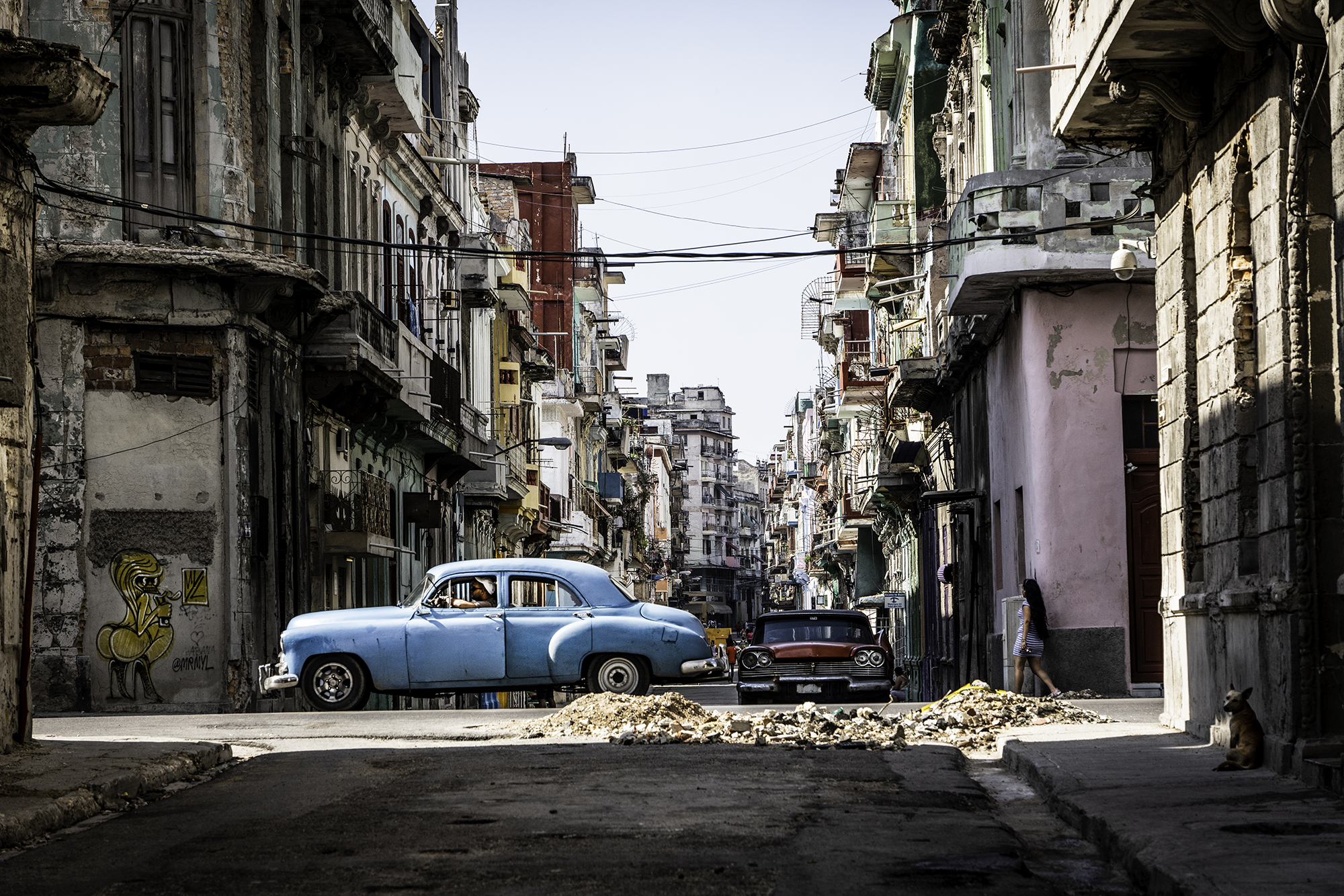 This street scene captures an urban vista in a historic yet weathered district in Havana Cuba, indicated by the vividly colorful but aging architecture and classic American cars of the 1950s. The photograph employs a linear perspective where the street and buildings converge toward a vanishing point in the distance, drawing the viewer’s eye deep into the composition and conveying a sense of depth and spatial complexity.