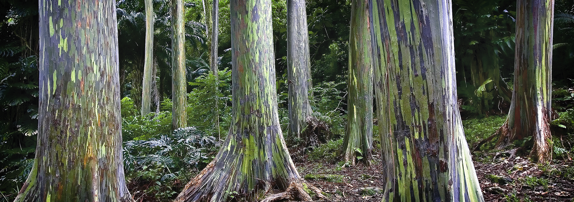 Set against a backdrop of dense tropical vegetation, the scene combines the organic beauty of the forest floor, layered with fallen leaves, moss, and ferns, with the towering, color-bathed trunks that emerge from the earth like artist’s columns. The texture of the bark varies from smooth to subtly peeling, revealing new vibrant layers underneath, symbolizing continuous renewal and intrinsic natural artistry.