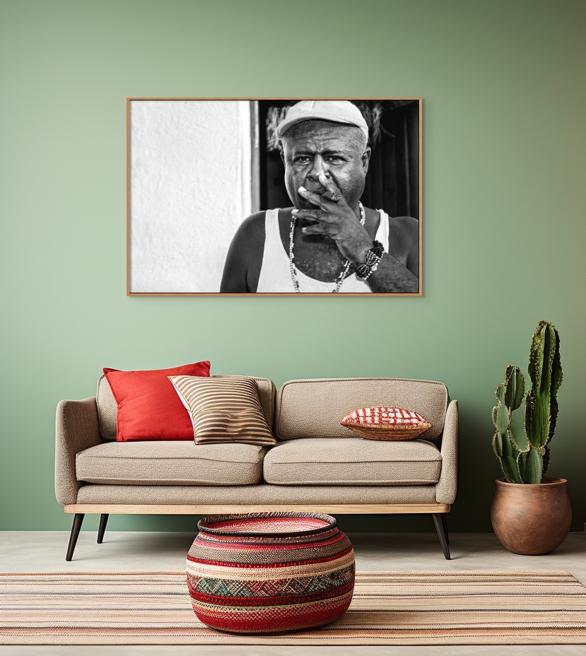 This black-and-white portrait captures a Santeria Priest in an intimate moment of contemplation and introspection. The subject’s deep-set eyes, focused yet distant, invite viewers to ponder the stories and experiences etched into his weathered face. The texture of his skin, accentuated by the monochromatic palette, reveals a lifetime of resilience and character.