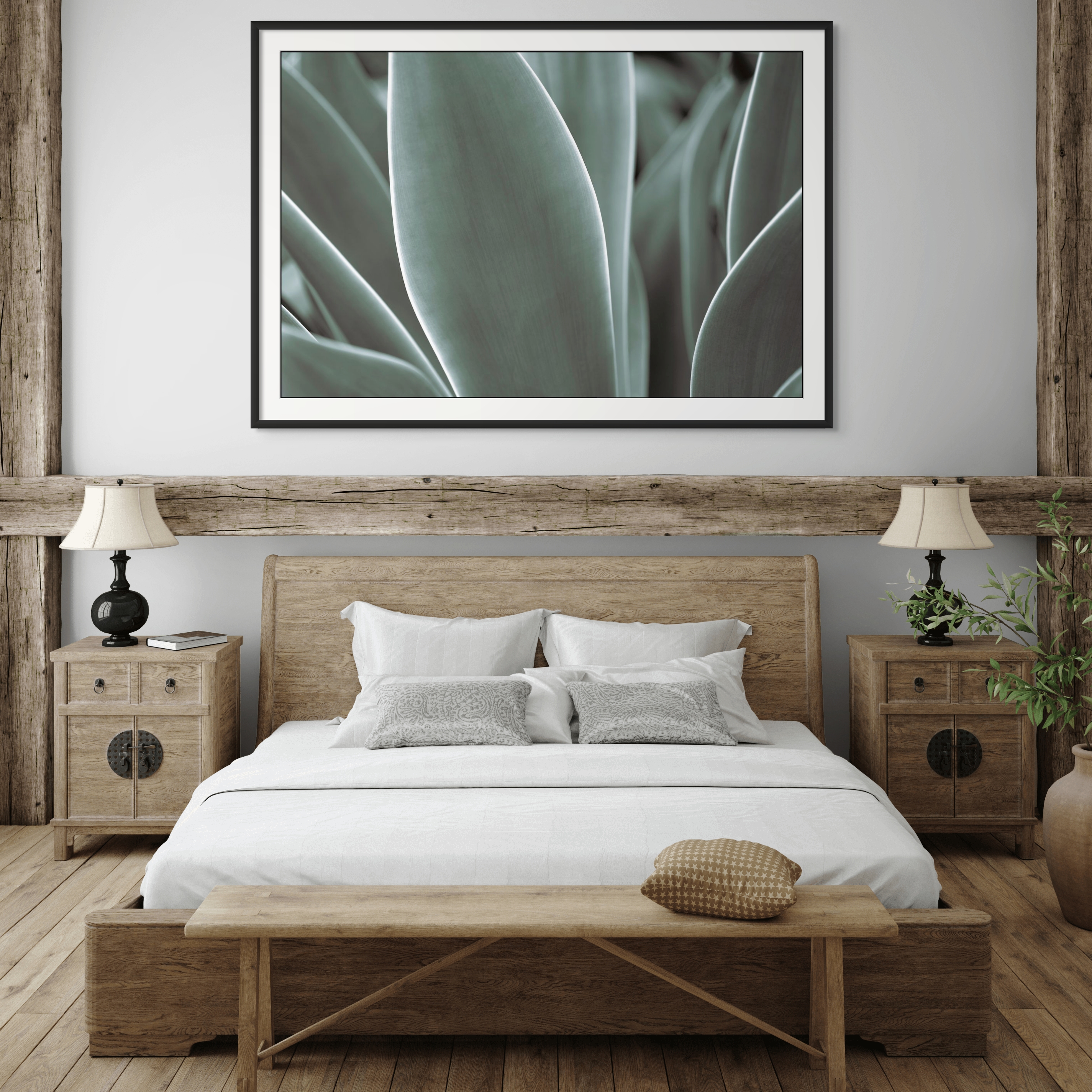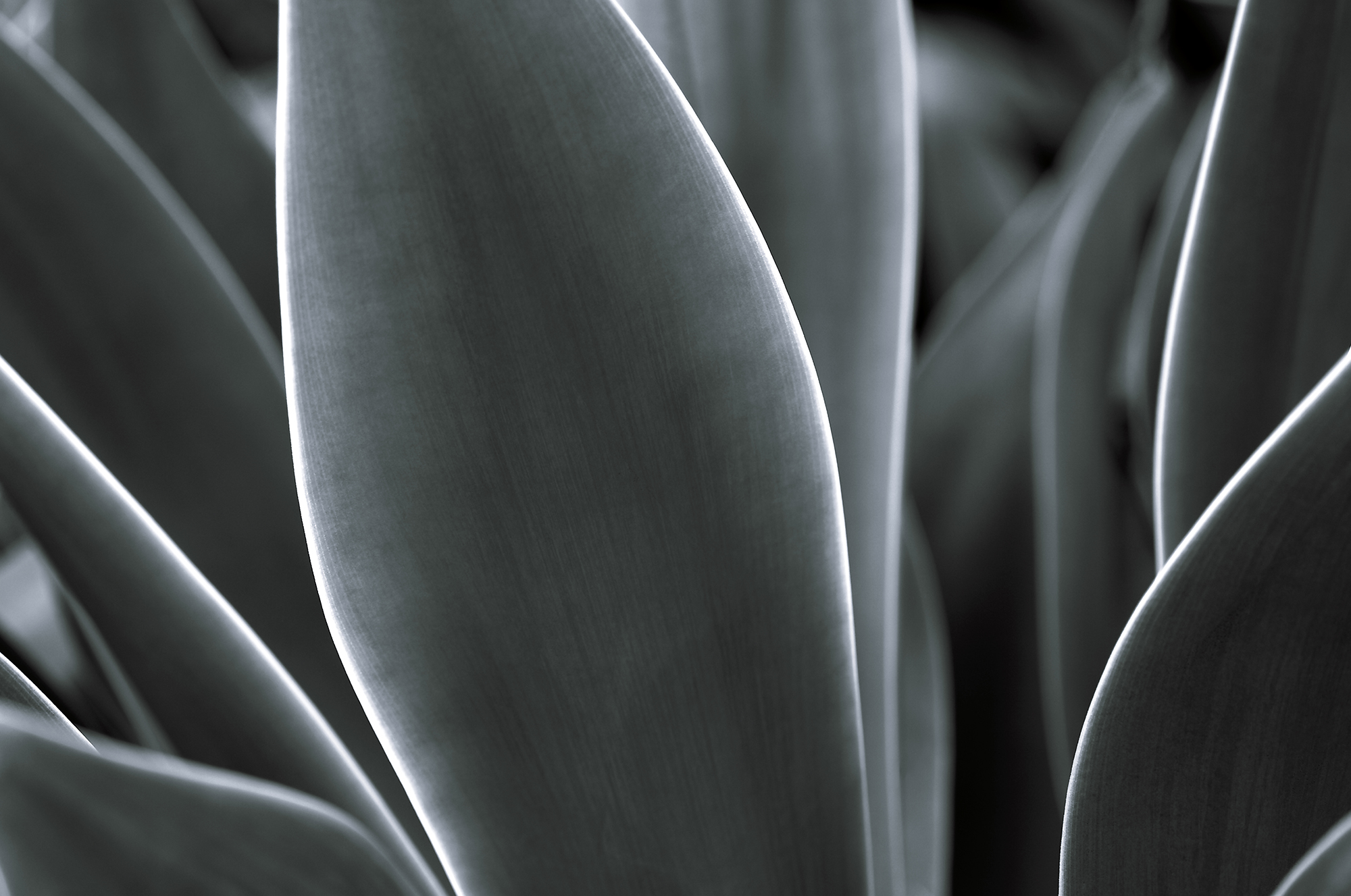 This captivating image presents a close-up view of several elongated, smooth succulent leaves rendered in a monochromatic palette with a subtle bluish-gray tint. The photograph focuses on the natural textures and organic forms of the leaves, emphasizing their gentle curves and the surface details visible in soft lighting. The composition invites the viewer into an intimate exploration of the plant’s structure, highlighting the interplay of light and shadow that delineates each leaf with a glowing edge. The blurred background creates depth and a sense of mystery, allowing the primary leaves to dominate the frame and captivate attention. This piece, notable for its minimalist approach and serene mood, reveals the inherent beauty in natural patterns, making it an evocative study in form and texture that transcends the ordinary into the realm of abstract art.