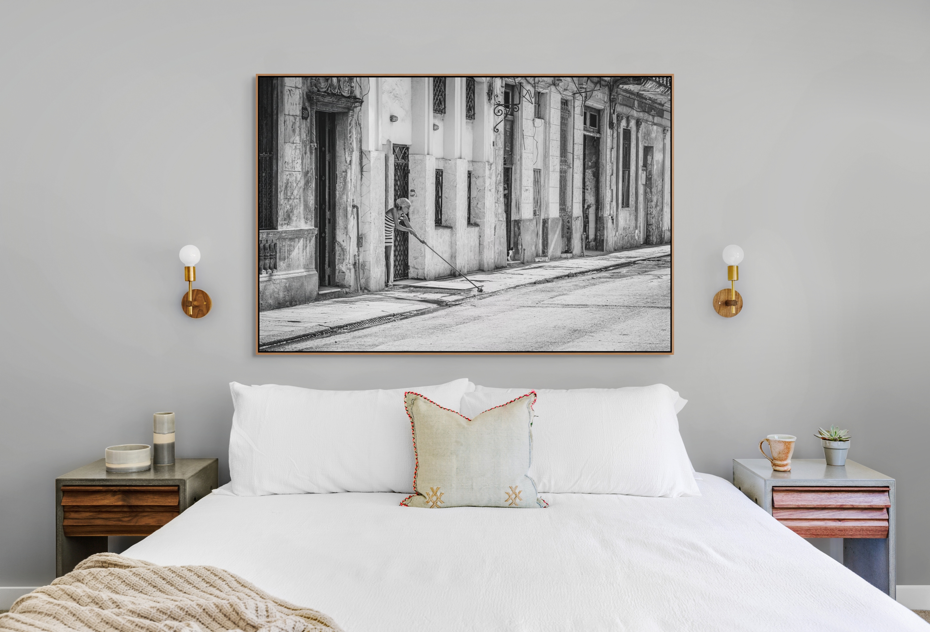 This black and white photograph captures a candid moment on a weathered urban street, suffused with a sense of timelessness and quiet resilience. The image, an elderly woman leaning out of an aged doorway, engages in the simple yet intimate act of sweeping the sidewalk into the gutter. Her striped dress and patterned headscarf contrast with the rough textures of the crumbling plaster and ornate stonework framing the doorways, highlighting the interplay between human presence and architectural decay.