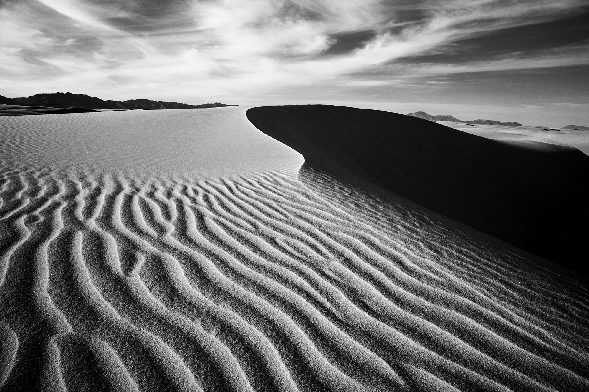 This black and white photograph captures the quintessential essence of a desert landscape, emphasizing the undulating forms and intricate textures of sand dunes. The composition is masterfully balanced with a prominent, sharply-curved dune ridge dividing the frame. On one side, the sand is sunlit and vividly detailed, showcasing rhythmic, wave-like ripples that create a hypnotic visual texture. On the other side, the dune plunges into deep shadow, producing a bold contrast and accentuating the dune's sculptural qualities.