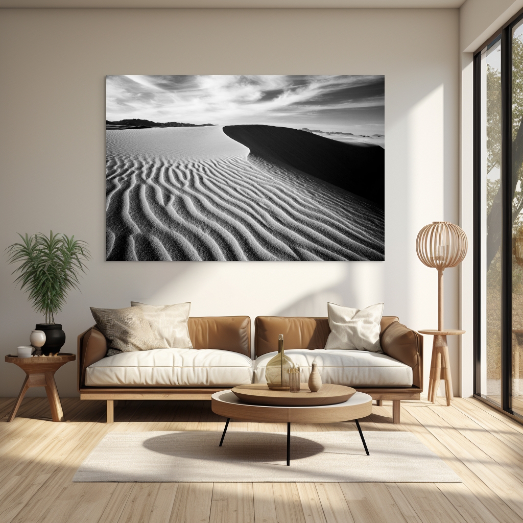 The monochromatic palette strips the image to its fundamental forms and tones, allowing the viewer to focus on the interplay between light and shadow, and the natural patterns created by wind and sand. This photograph invites contemplation on nature’s artistry, time’s slow passage, and the serene, almost abstract beauty found in seemingly barren environments.