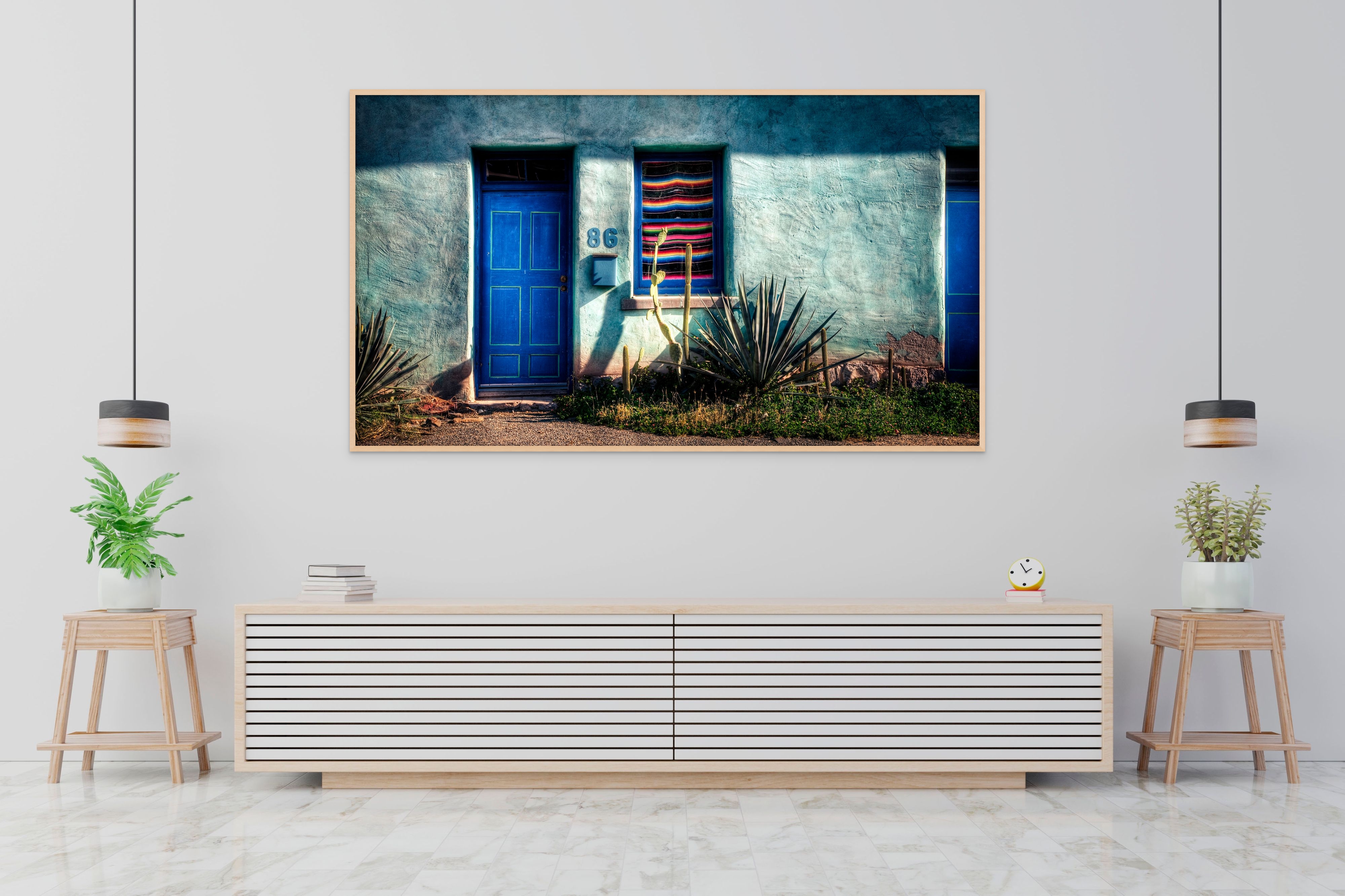 This image captures a vividly textured exterior wall of a residential building, bathed in the warm, slanting light of the late afternoon sun. The focal point is a bold, cobalt blue door marked with the number 86, its surface subtly outlined in faint green accents that catch the light's edge. Adjacent to the door, a window is adorned with a colorful striped tapestry featuring a palette of vibrant reds, oranges, greens, blues, and blacks, adding a lively contrast to the cool tones of the weathered wall.