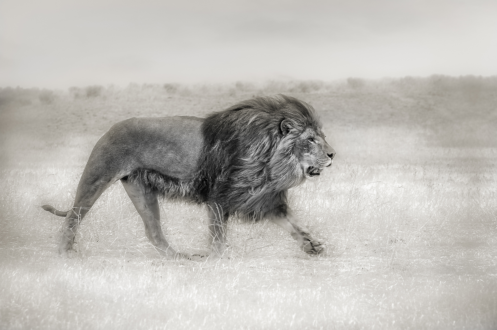 This captured moment, entitled Lone Monarch, masterfully captures a side profile of a majestic male lion as it strides across a vast landscape. The image is rendered predominantly in monochromatic tones of soft grays and muted sepias, creating an ethereal and timeless quality that elevates the subject to a near-mythical status.