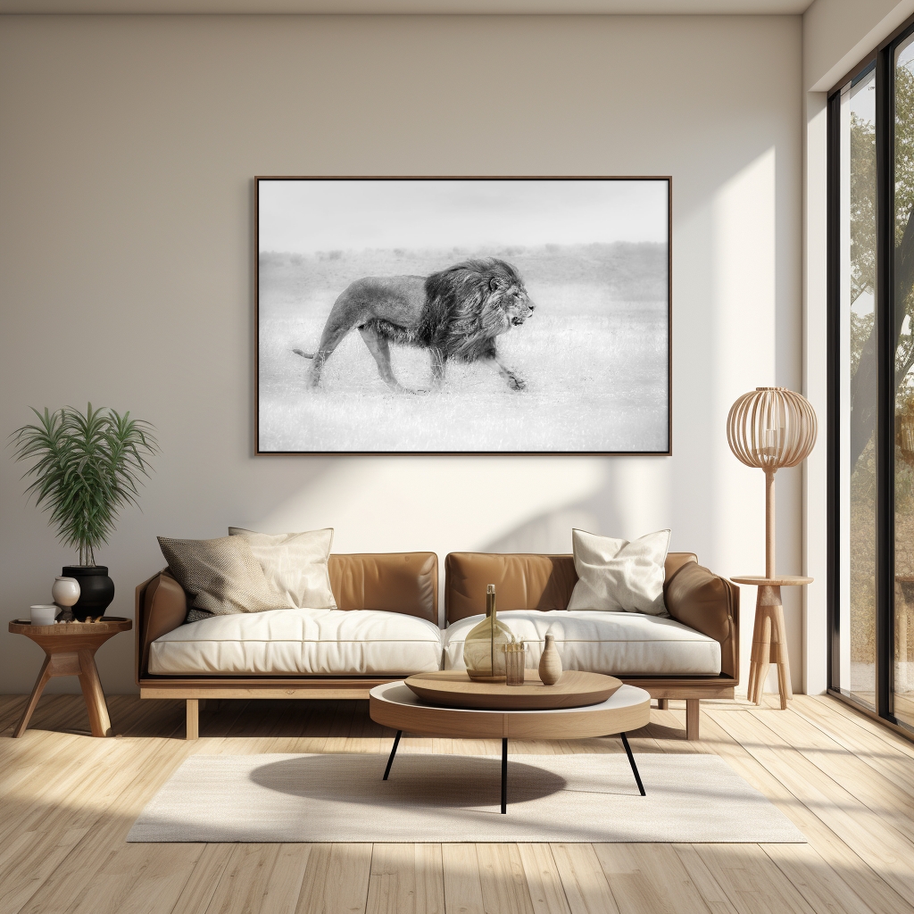 Lone Monarch speaks to themes of solitude, dominance, and the enduring spirit of nature's wild kings. Its subtle tonal palette and refined composition render it a poignant and meditative work, inviting contemplation on the majestic beauty and silent strength embodied by the lion in the wild. This piece elegantly balances realism with artistic sensitivity celebrating wildlife and the natural world.