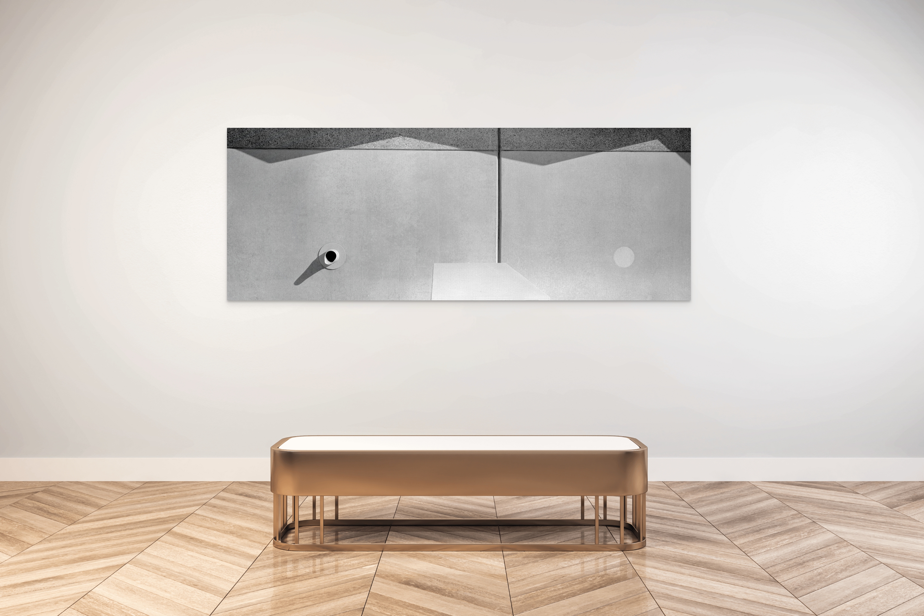 Towards the right, a barely discernible circular mark or light imprint appears on the concrete, subtle yet intentional, adding a delicate element of visual interest and balance opposite the pipe.