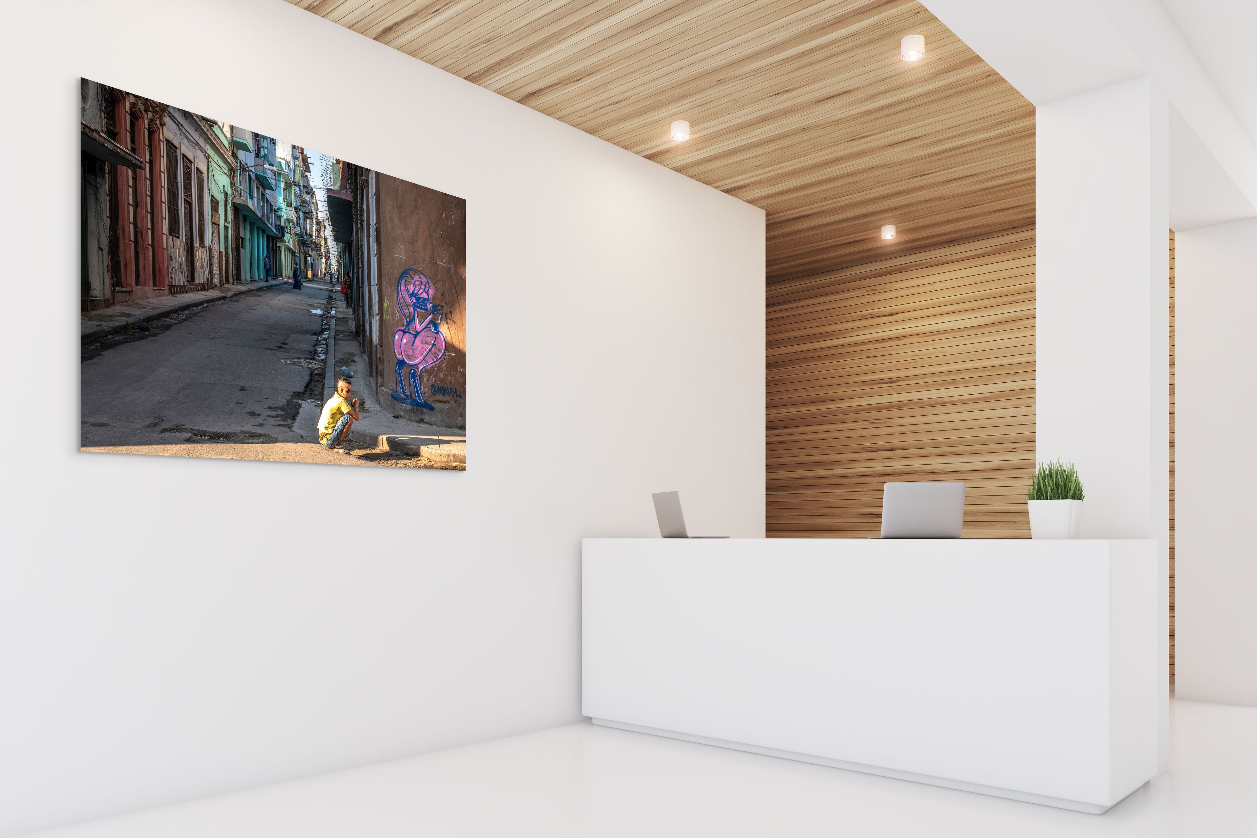 The street itself extends into the distance, creating strong linear perspective, with a few pedestrians and residents scattered further down, contributing to the narrative of daily life within this vibrant and dynamic setting. The interplay of natural light, shadows, and colors enhances the texture and ambiance, inviting viewers to contemplate the intersection of art, community, and individual expression in urban spaces.