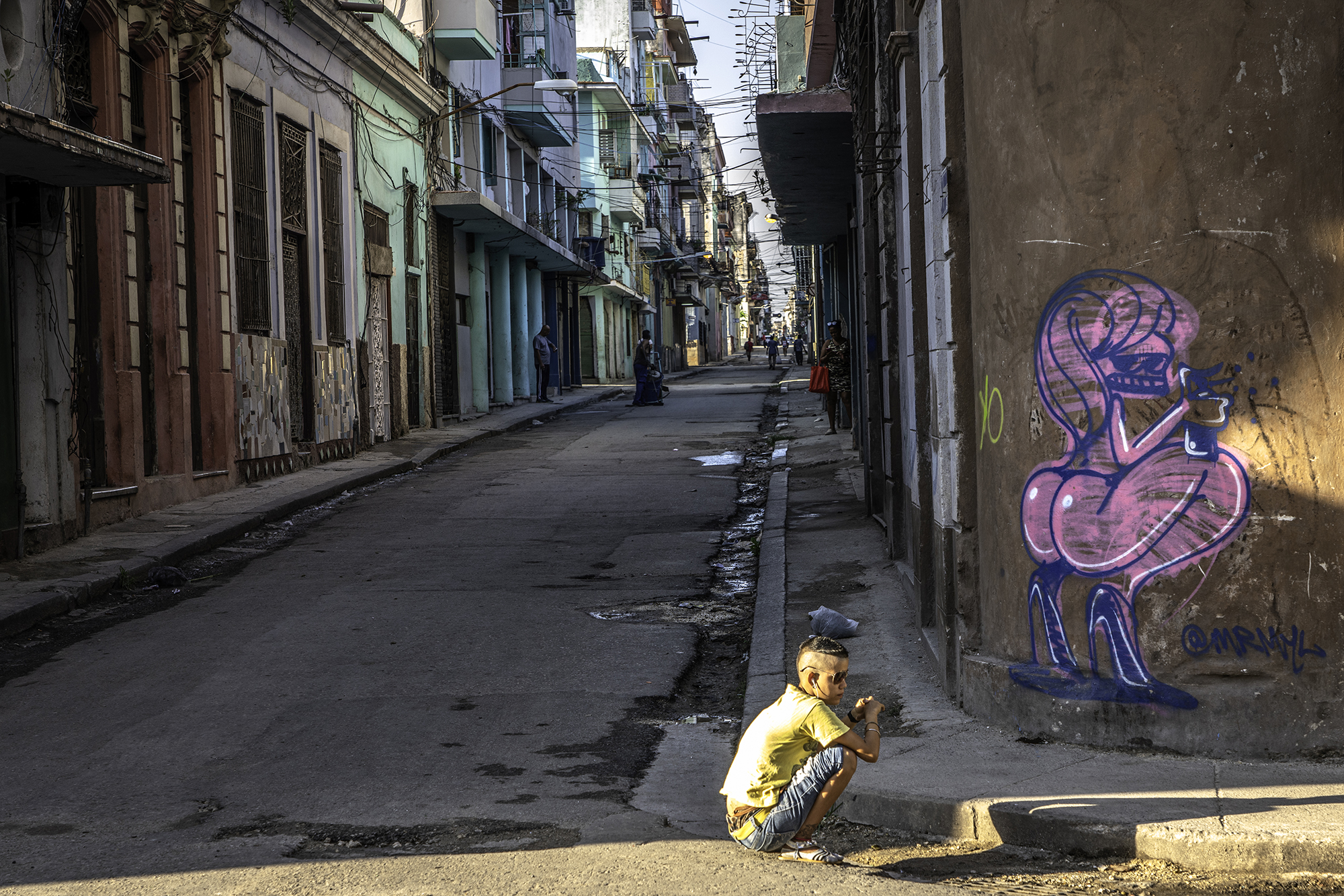 In the foreground, a young boy squats near the edge of the sidewalk, almost mimicking the graffiti artwork next to him. He wears a bright yellow T-shirt, denim shorts, and sandals, and sports sunglasses and earphones, suggesting a blend of local culture with contemporary youth style.