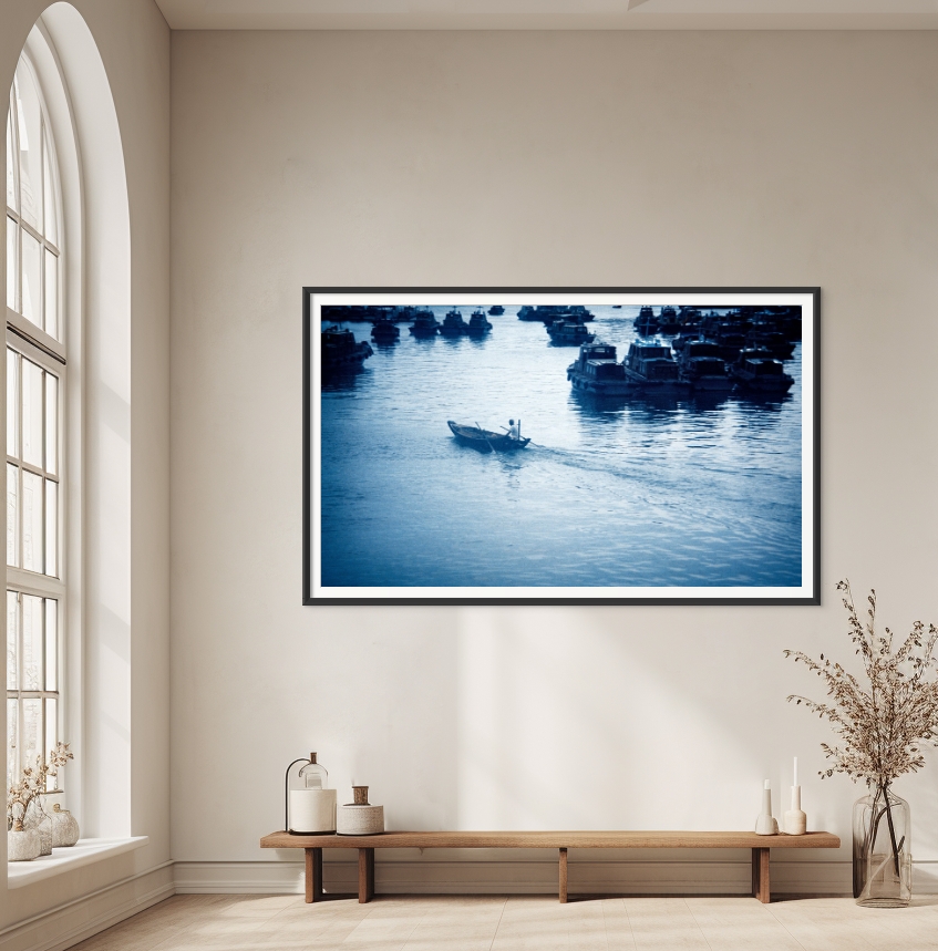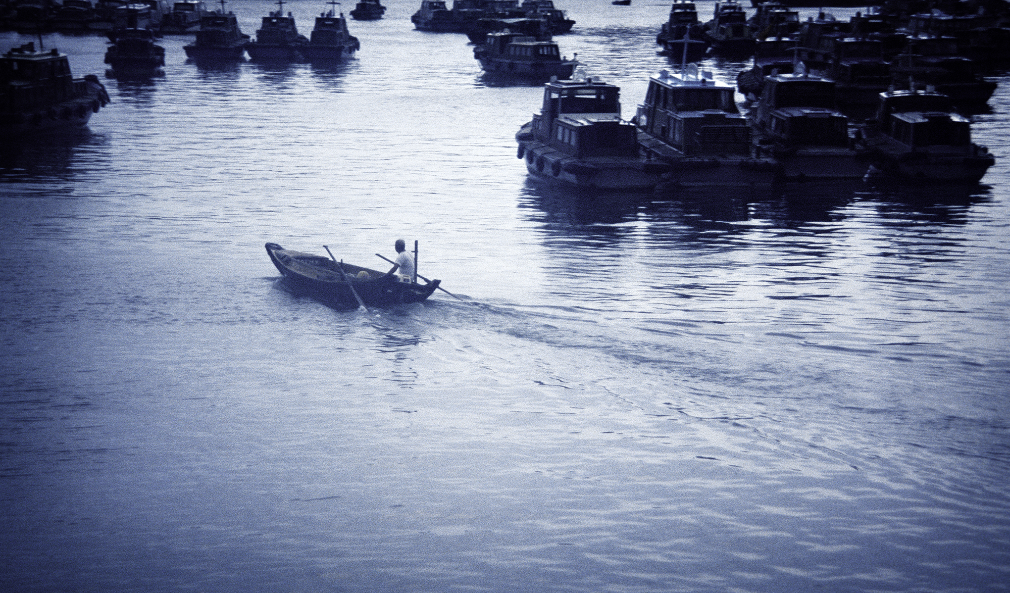The lone man's posture, slightly hunched yet purposeful, evokes themes of solitude, resilience, and determination. The surrounding boats, uniform and stationary, emphasize the rower's dynamic movement and individuality. The photograph’s grainy texture and subdued lighting convey a timeless, contemplative mood, inviting reflection on man's relationship with nature and the passage through life's solitary and shared moments.
