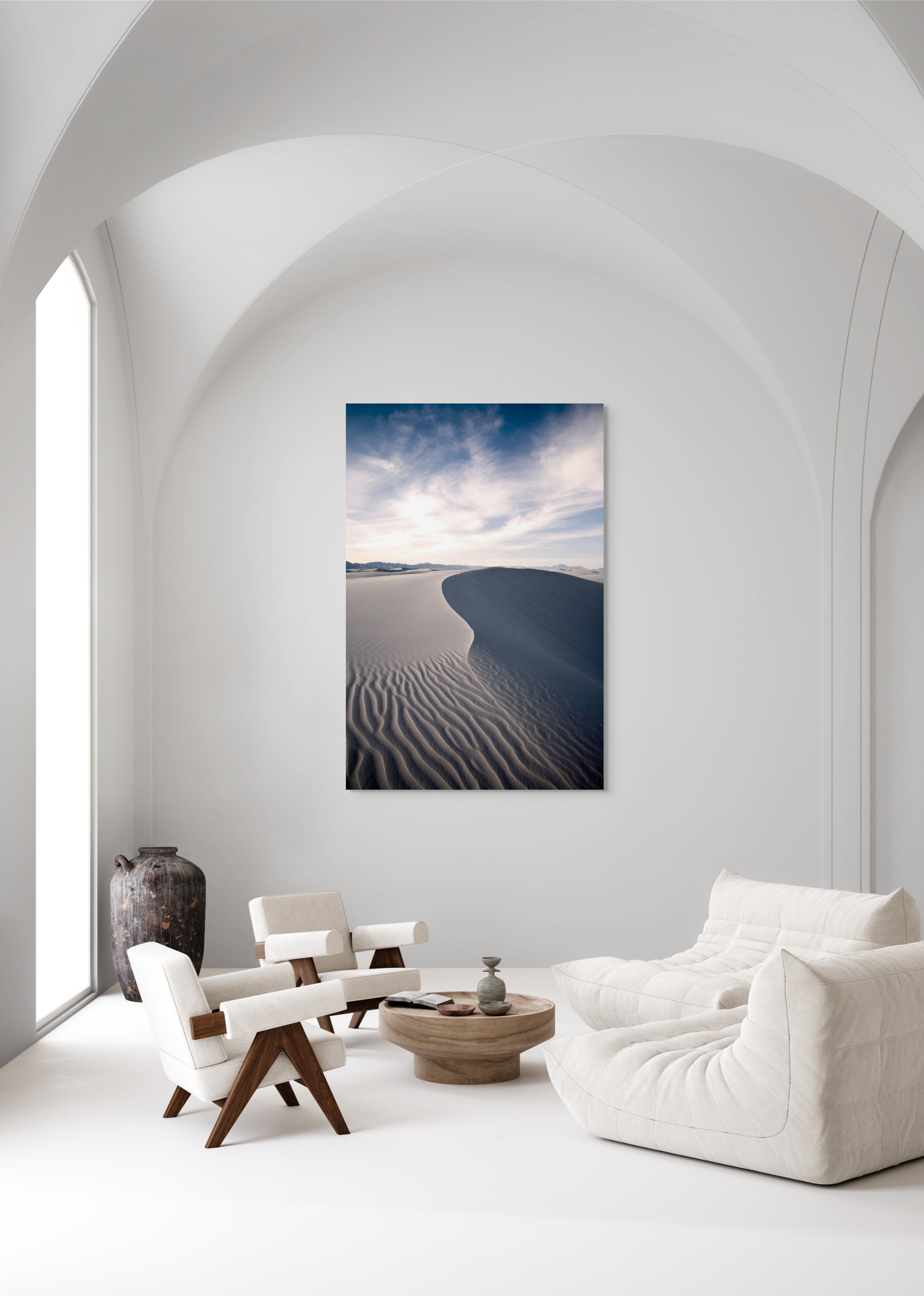 The composition employs a high vantage point, offering a sense of scale and depth. The interplay of light and shadow is masterfully captured, with the sun positioned behind partial clouds, casting soft, diffused lighting that accentuates the dune's contours while adding a serene tonal gradient across the sand. The sky above is an ethereal mix of blues and whites, adding a cool contrast to the warmer tones of the sand and further emphasizing the vastness and tranquility of the desert environment.