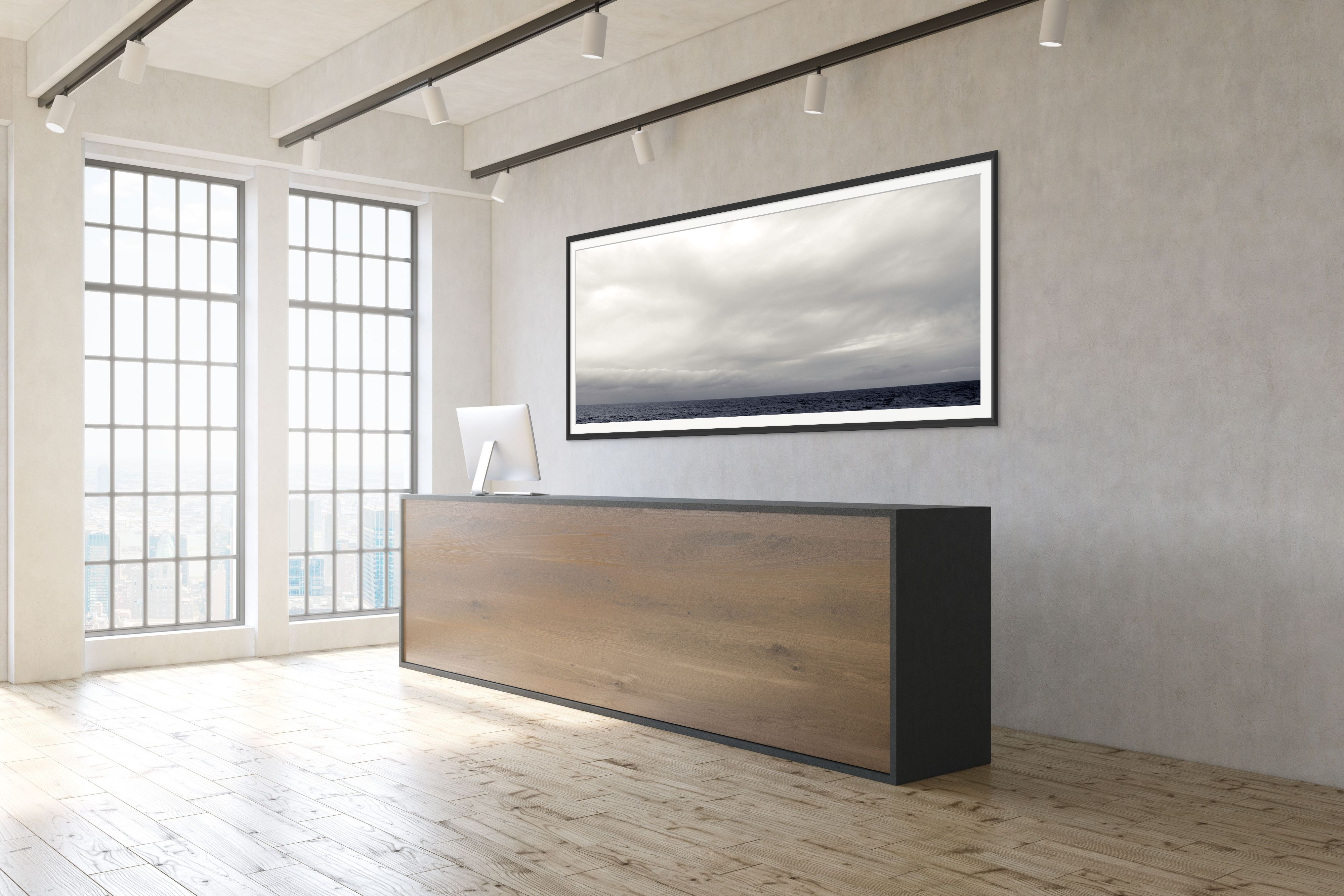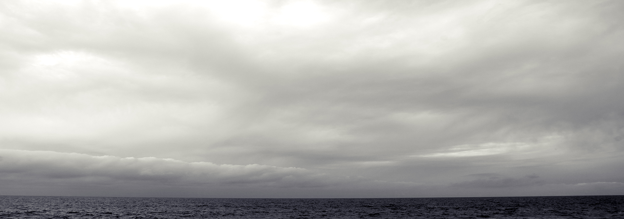 This image captures a sweeping oceanic horizon beneath a vast, overcast sky. The composition is horizontally oriented, emphasizing the expansive nature of the seascape. The lower portion of the artwork is dominated by the textured, slightly rippled surface of the sea, rendered in muted dark blues and grays. This contrasts subtly with the upper three-quarters of the frame, where a thick, heavy layer of clouds blankets the sky in various soft gradients of white, gray, and pale blue.
