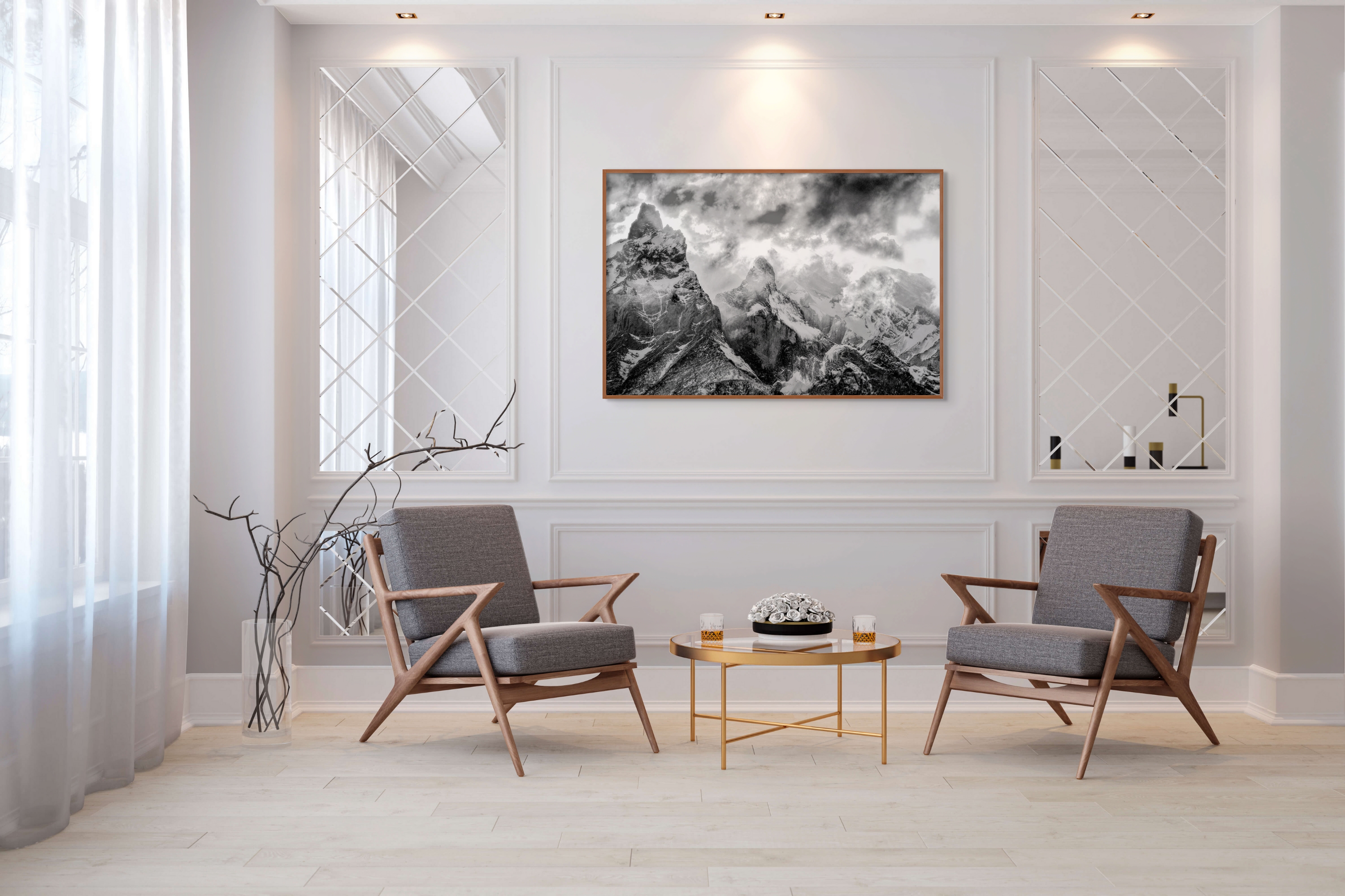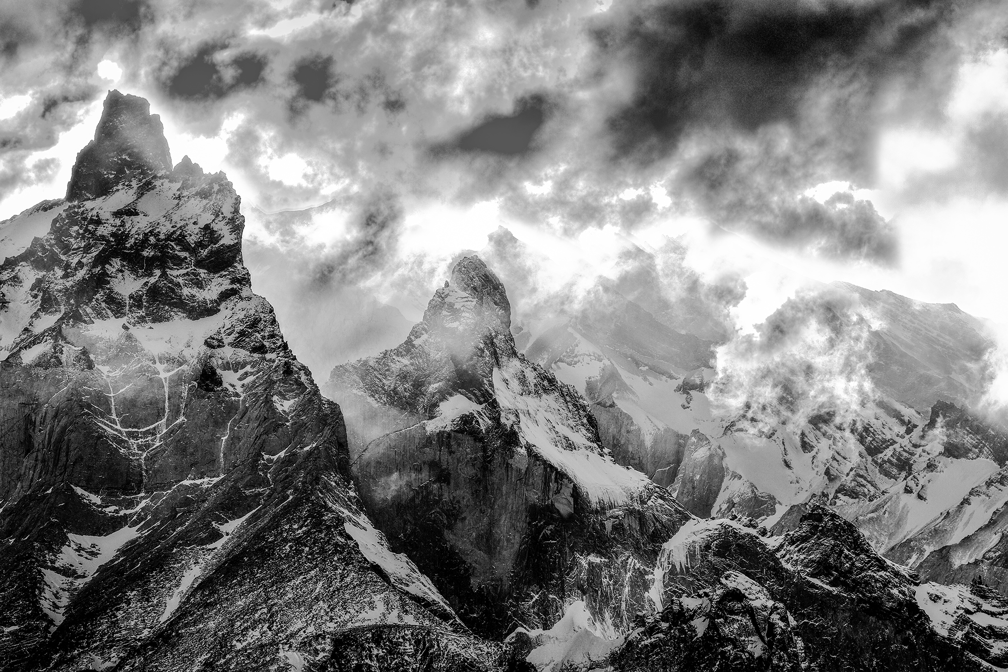 Evocative of the sublime, the image is imprinted with a stark contrast between light and shadow, which amplifies the mountainous forms' monumental scale and intricate details. The snow highlights the sharp edges and crevices, while the clouds engulfs parts of the peaks in mysterious veils, suggesting shifting weather and the ever-changing facets of nature. The photograph’s monochromatic treatment lends it a timeless quality, reinforcing the permanence and endurance of these natural features in contrast to the ephemeral atmospheric elements.