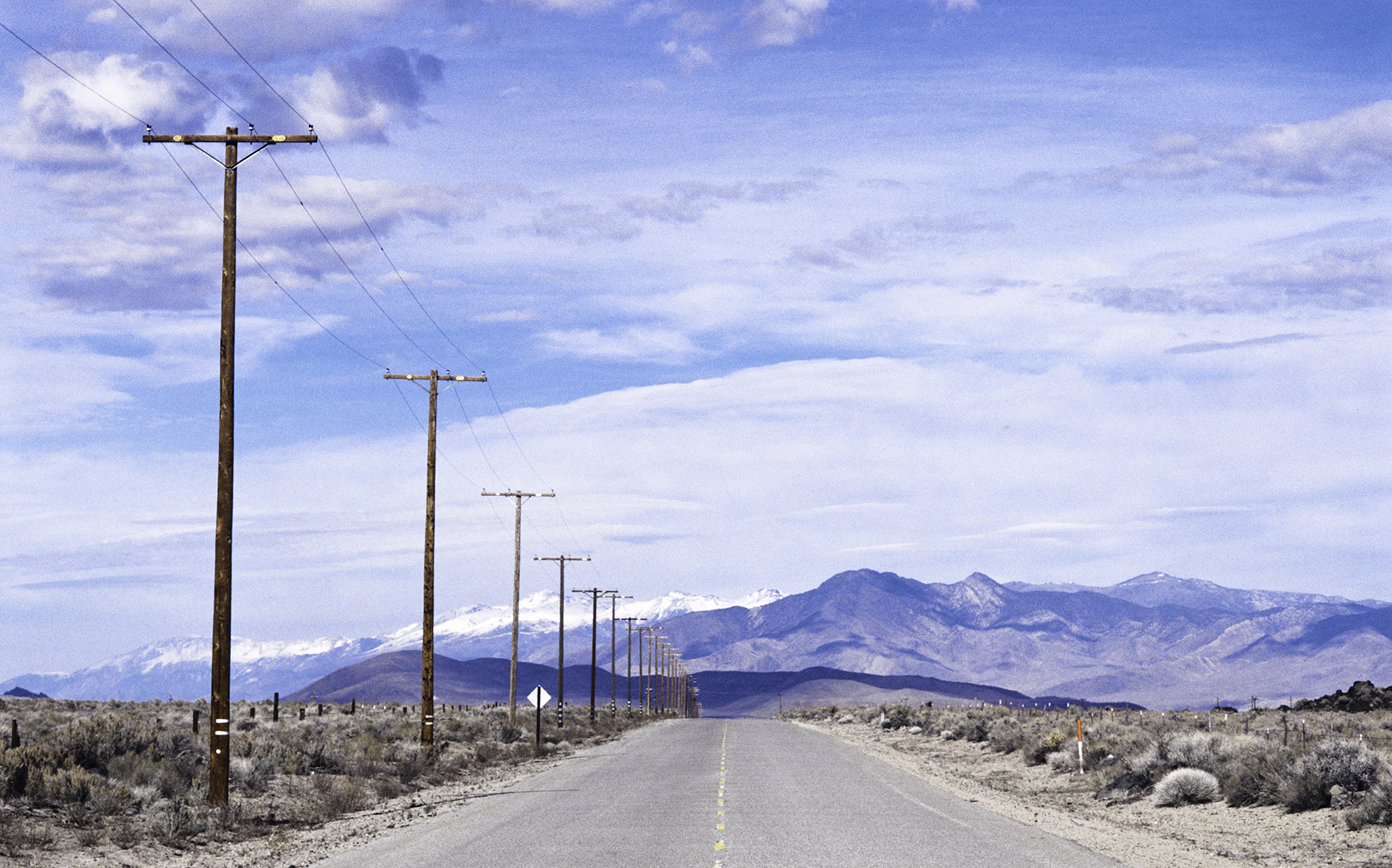 This photograph captures a quintessential scene of solitude and expansive openness characteristic of desert landscapes in the American Southwest. The composition is dominated by a long, straight asphalt road vanishing into the horizon, drawing the viewer's eye deep into the image and evoking the sensation of an endless journey. Flanking the roadway are parallel lines of telephone poles that gradually diminish in size, accentuating the depth and perspective.