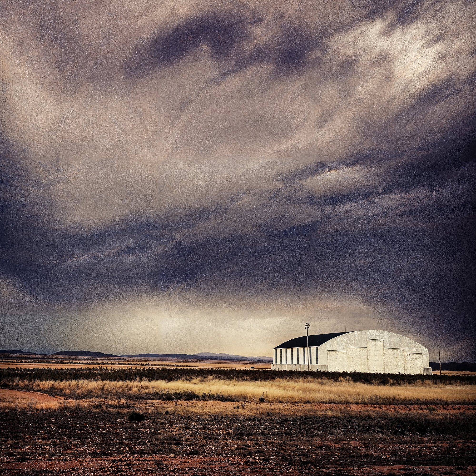 This image presents a lone, white industrial hangar set against the expansive backdrop of a brooding sky. The building, with its clean, geometric lines and stark white facade, contrasts diametrically with the vast, untamed natural landscape that surrounds it. The foreground is a patch of dry earth interspersed with golden wild grasses, suggesting an environment that is both remote and harsh.