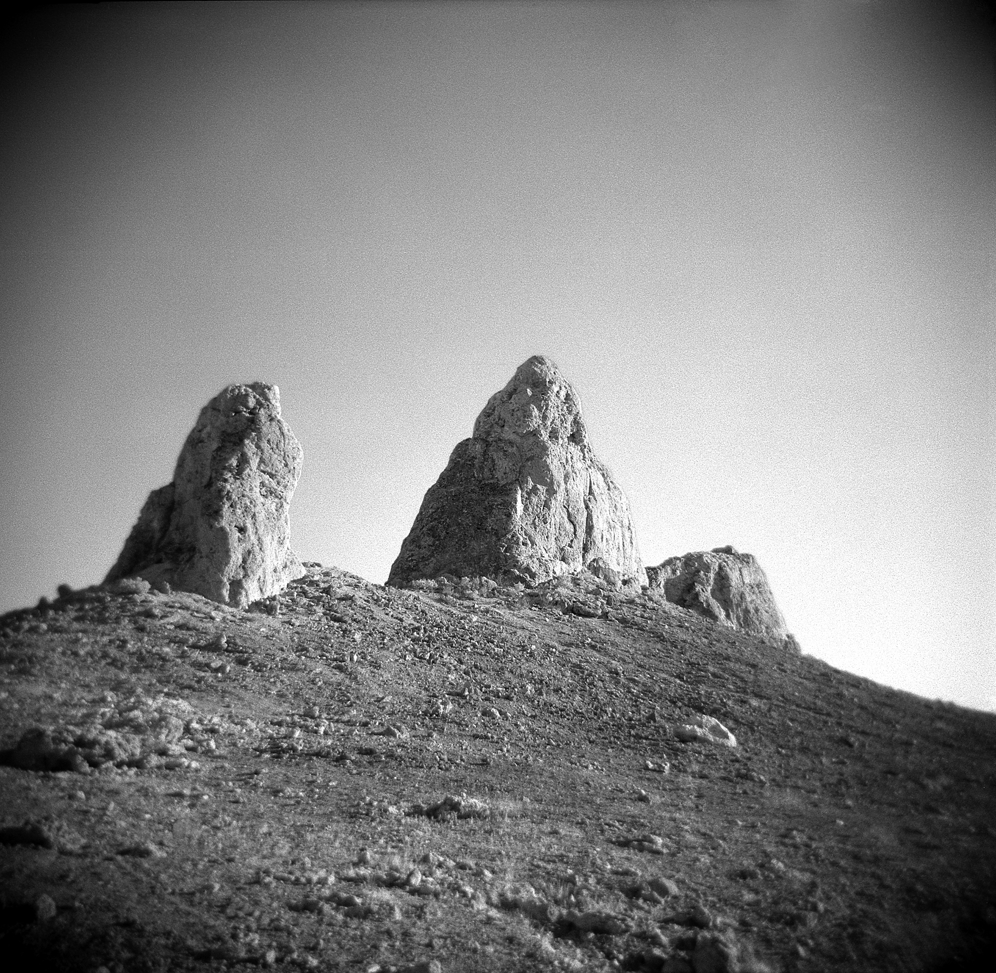 This black and white photograph captures a stark, minimalist landscape dominated by a trio of prominent rock formations rising from a rugged terrain. The image is framed from a low vantage point, emphasizing the towering presence of these natural sculptures against an expansive, unadorned sky. The central rock formation is the tallest and most imposing, with a rugged texture highlighted by the interplay of light and shadow, suggesting a midday sun casting soft but distinct highlights.