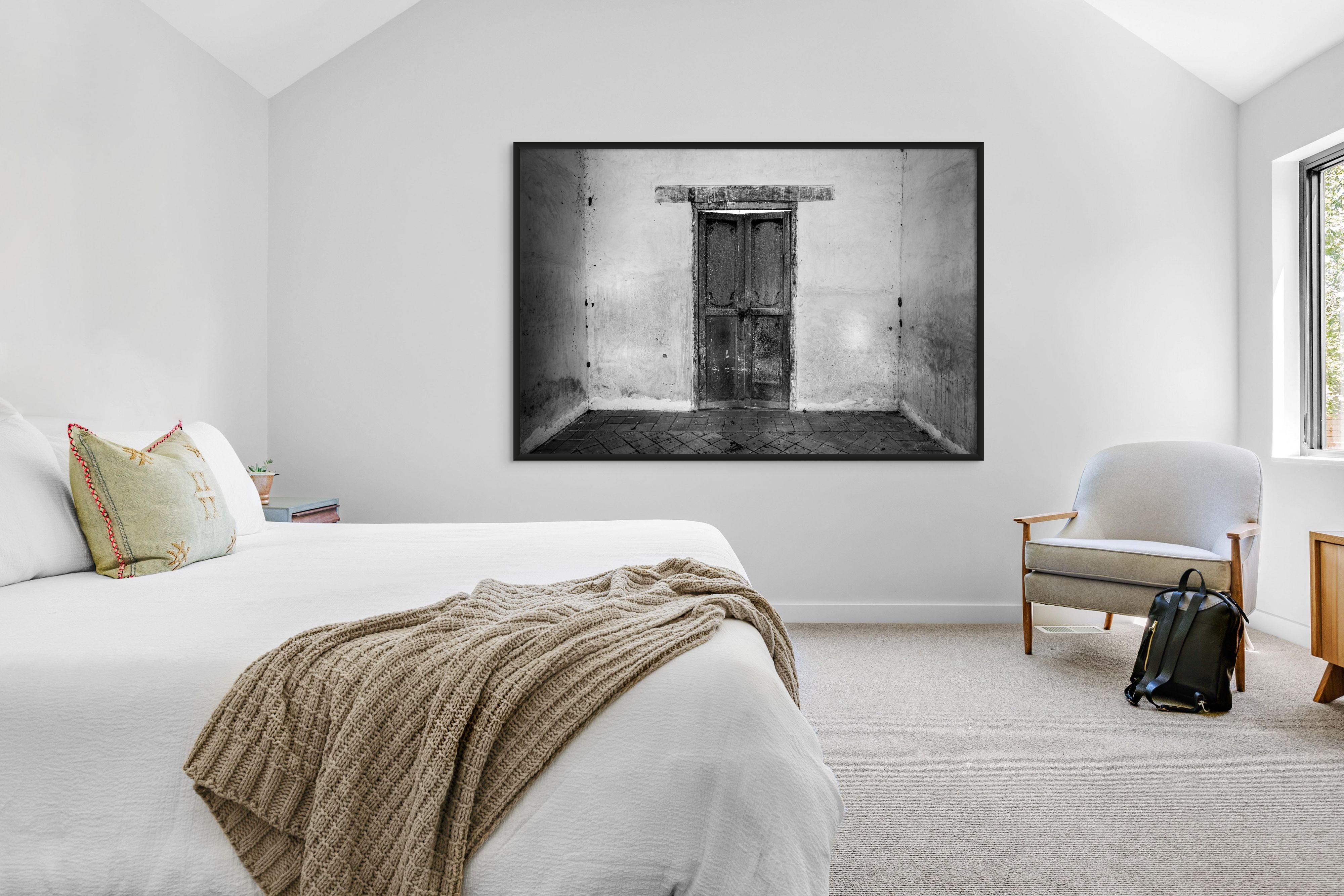 The photograph's framing and monochrome treatment emphasize form and texture over color, inviting the viewer to focus on the materiality and quiet presence of the space. The overall effect is one of stillness and introspection, a moment frozen at the threshold between past and present.
