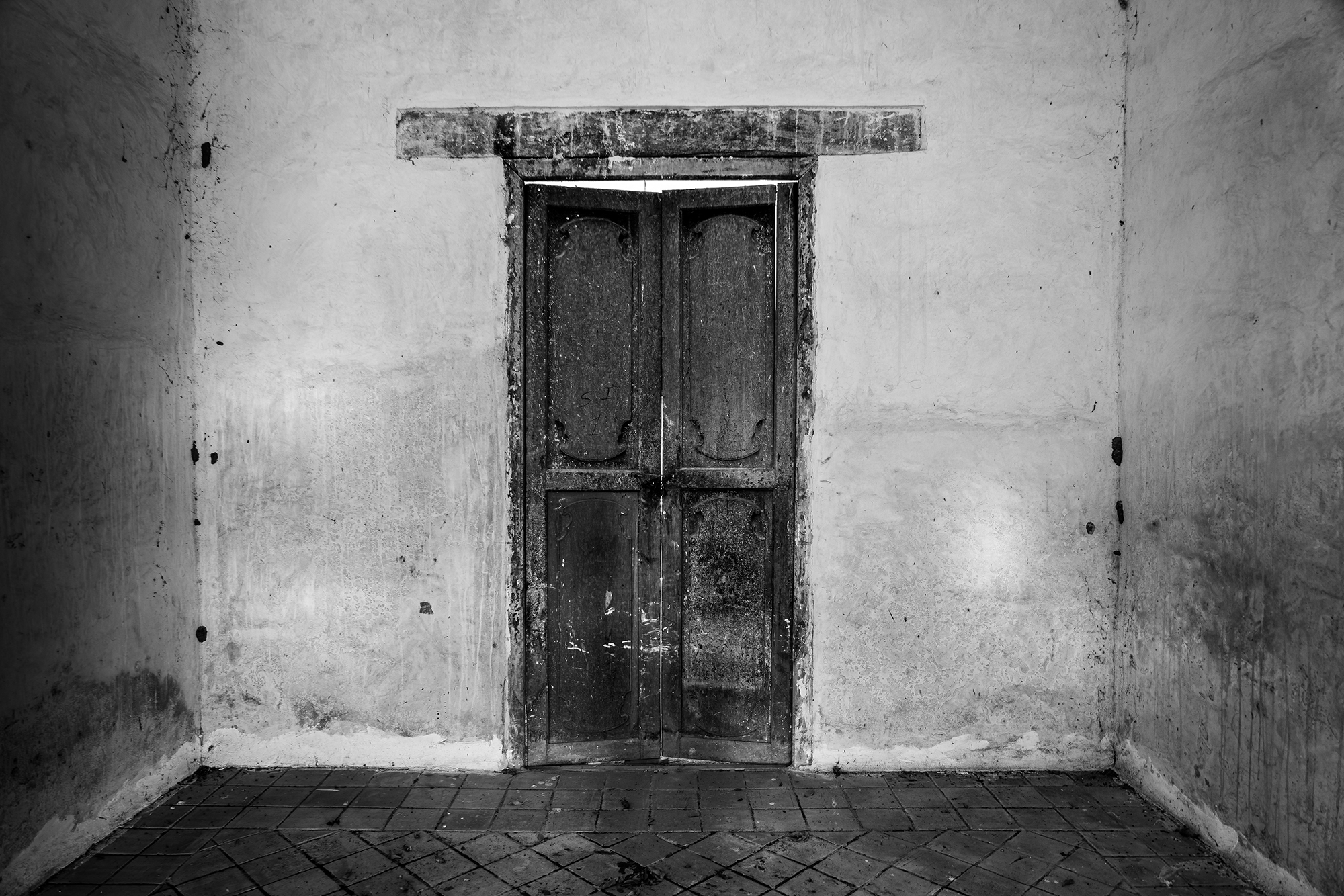 The walls surrounding the door are textured with peeling plaster and stains, displaying an organic interplay of shadow and light that enhances the tactile quality of the surfaces. The floor, composed of differently patterned tiles - diagonal in the central area and square along the edges, adds contrast to the otherwise monochromatic palette. The worn corners of the room and subtle grime reinforce the feeling of abandonment or neglect, evoking contemplation of impermanence and memory.