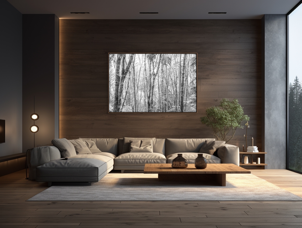 The interplay of light and shadow is masterfully controlled, with the bright illumination seemingly diffused through a canopy of bare branches overhead. This lighting emphasizes the fine web of twigs and leaves, creating a layered, almost three-dimensional effect that draws the eye deeper into the forest's depths. The undergrowth is subtle yet present, grounding the scene with ferns and smaller shrubs that add to the overall texture without detracting from the prominence of the towering trunks.