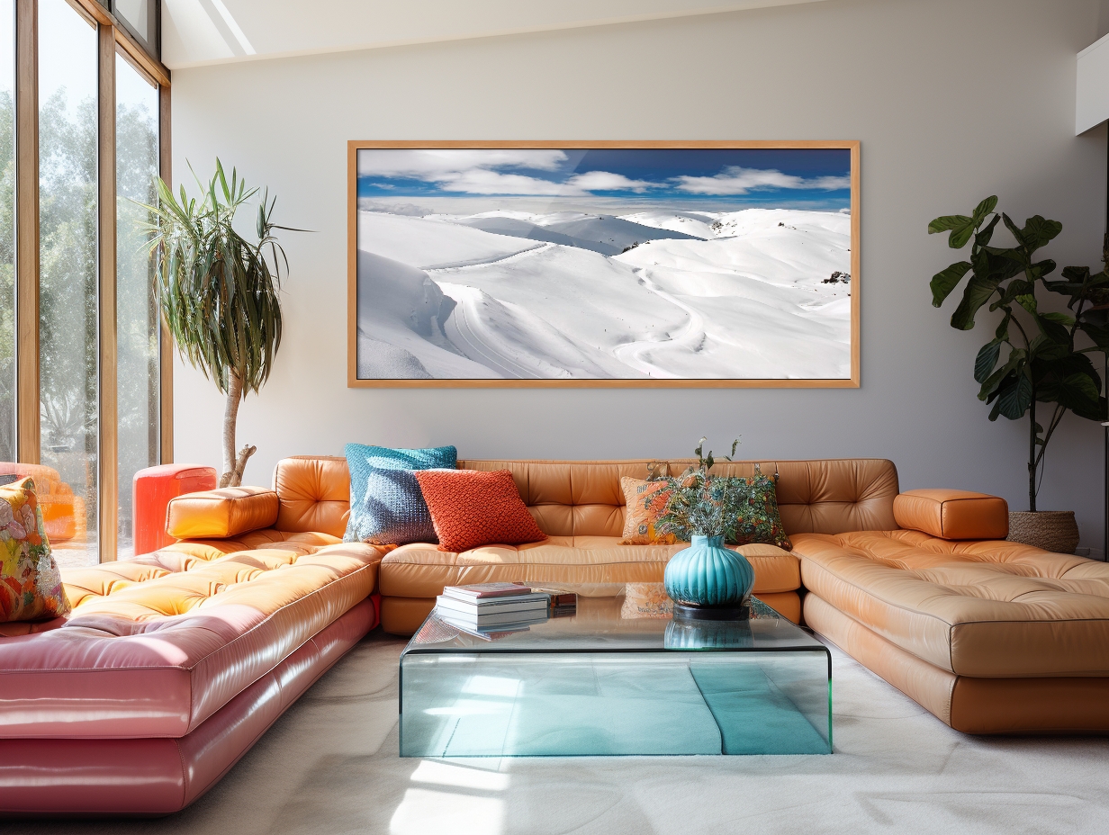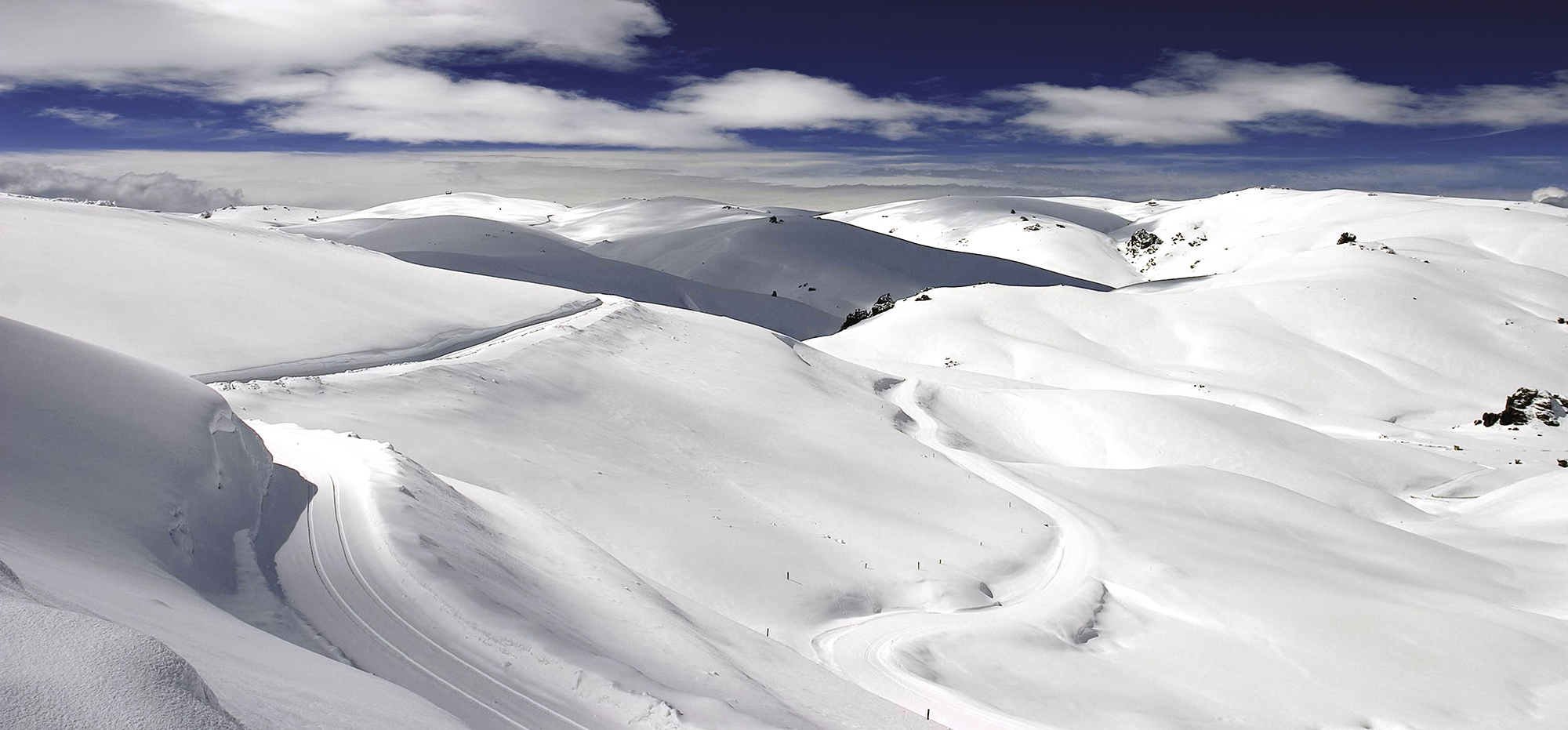 This breathtaking image captures an expansive snow-covered landscape under a vivid blue sky lightly brushed with clouds. The composition showcases a series of rolling hills blanketed in pristine white snow, softened by the gentle contours of nature’s design. The snow's immaculate surface is interrupted only by a meandering path that weaves through the terrain, inviting the viewer's eye to travel deeper into the scene. The contrast between the bright snow and the deep blue sky creates a striking visual harmony, emphasizing the purity and tranquility of the winter environment.