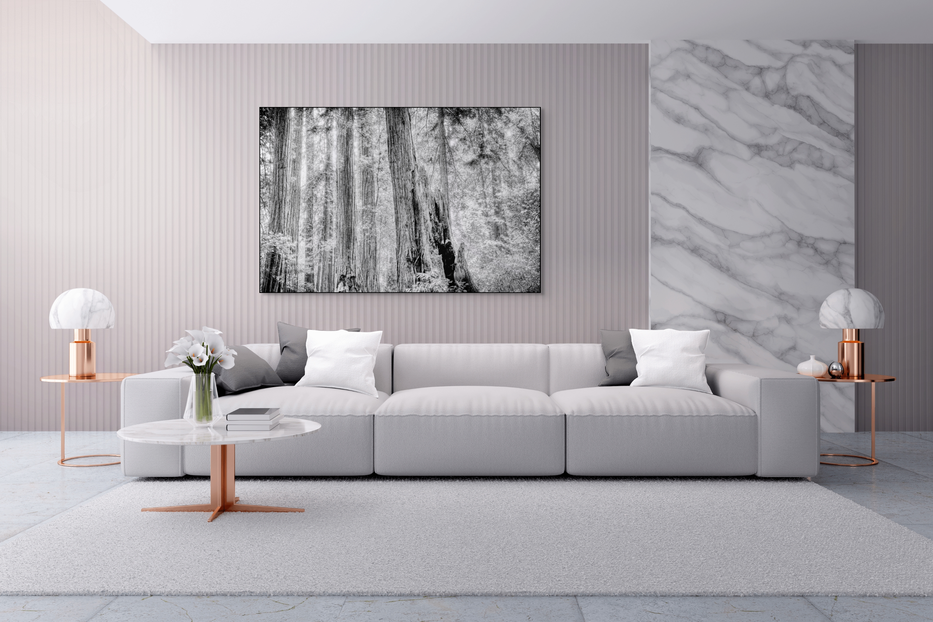 The monochromatic palette accentuates the varied tonal dynamics—from the deep, shadowed grooves in the bark to the ethereal, sunlit canopy diffusing light softly through the dense foliage. This interplay of light and shadow lends the image an almost mystical ambiance, encouraging the viewer to contemplate the serene yet powerful presence of these giants.