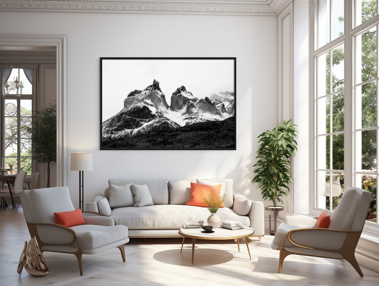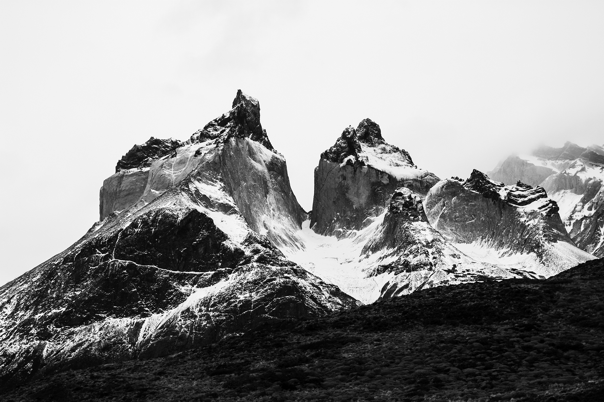 This striking black and white photograph captures a dramatic mountain range, its rugged peaks dusted with snow. The image centers on jagged cliffs and steep rock faces which dominate the composition, showcasing the sheer power and grandeur of nature. The texture and detail of the rocky surfaces are accentuated by the monochromatic palette, highlighting the contrasts between the snow-covered slopes and the darker, exposed rock. The mist or clouds gently obscure parts of the peaks on the right, adding a sense of mystery and depth. The foreground features a darker, softer terrain that contrasts with the sharpness of the mountains, creating a compelling visual balance. This evocative photograph conveys both the sublime beauty and the formidable scale of mountainous landscapes. The use of black and white emphasizes form and tone, allowing the viewer to engage deeply with the stark natural elements and the timeless majesty of the scene.