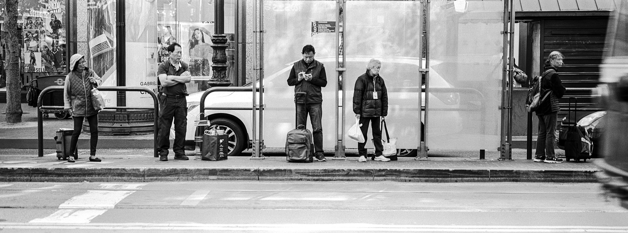 The photograph’s composition is balanced with architectural elements like the bus shelter’s metallic frame and a streetlamp adding to the urban setting. Reflections on the glass panels and faint motion blur on the right side imply movement around this static moment, enhancing the feeling of transience and anticipation.