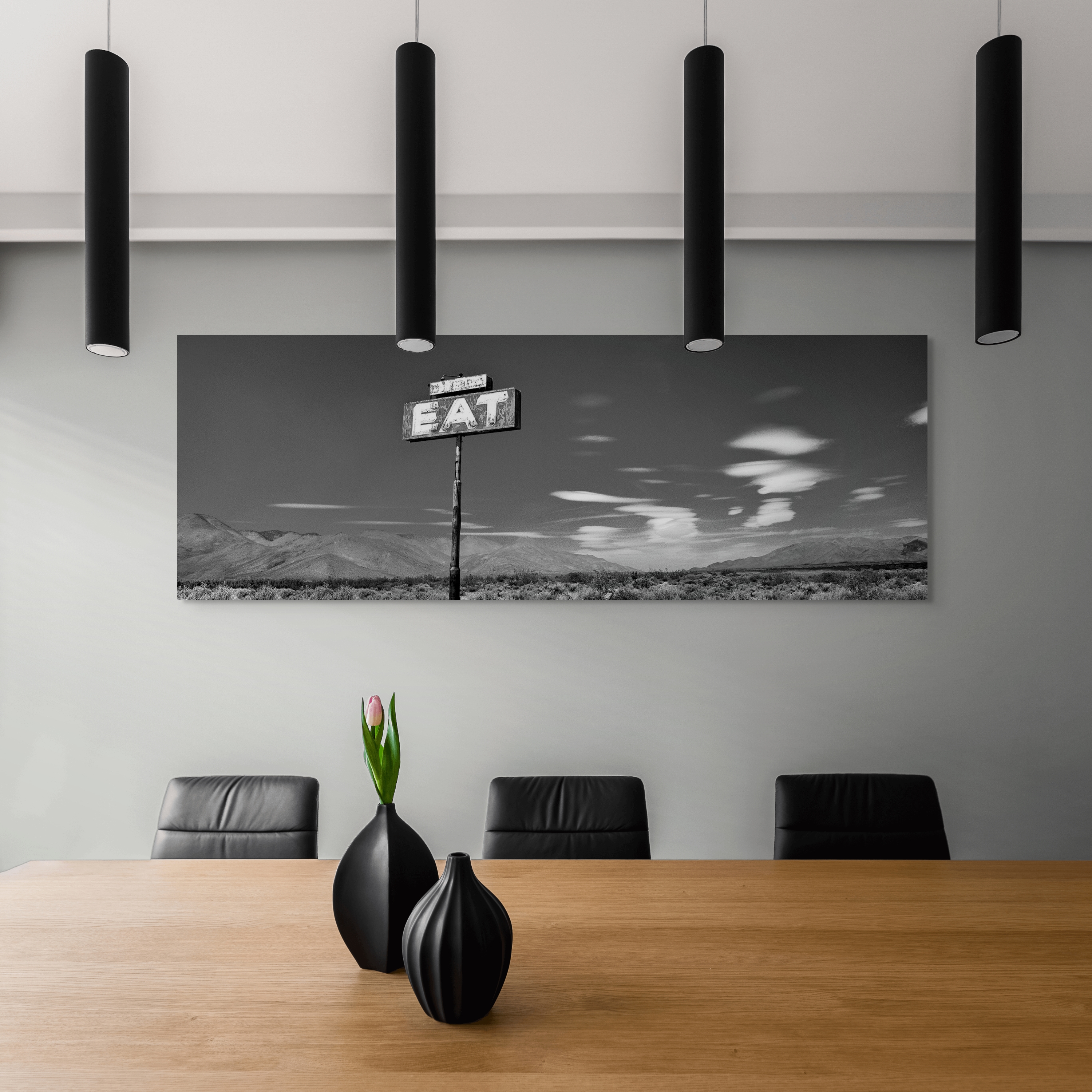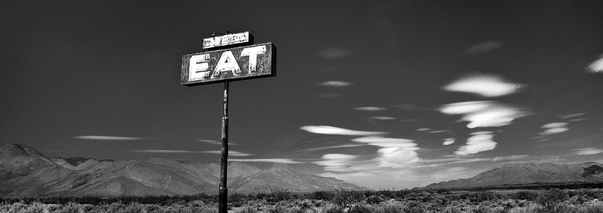 This black and white photograph captures a solitary, weathered sign from a previous era. Emblazoned prominently with the word EAT, it stands starkly against a vast, expansive backdrop of desert landscape and distant mountain ranges. The rough texture and faded paint on the sign suggest age and exposure to the elements, evoking a sense of nostalgia and decay.