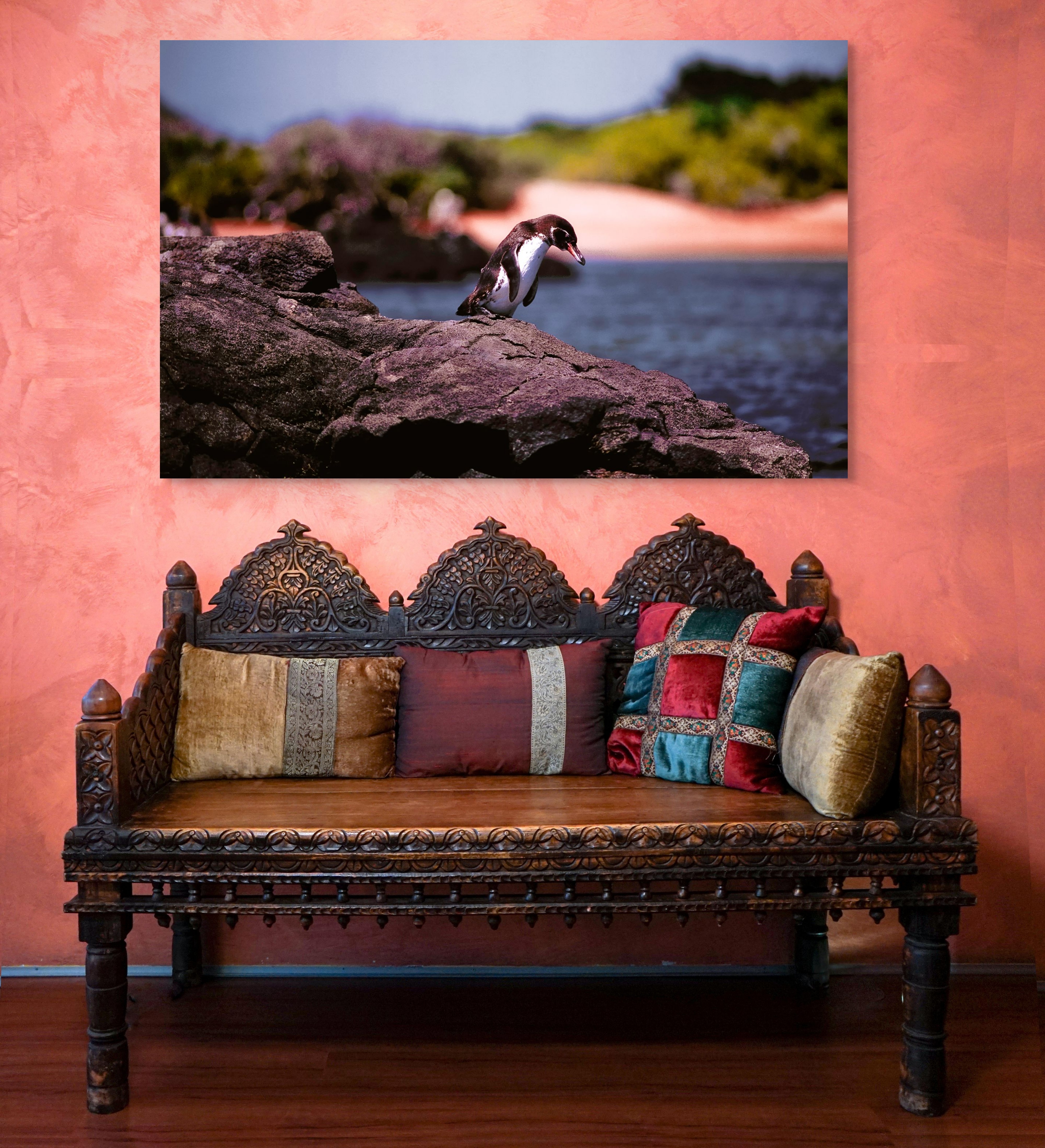 The interplay of muted earth tones and the contrasting colors of the penguin draw the viewer's attention to the subtle narrative of isolation and tranquility in nature. The photograph evokes a sense of peaceful solitude while highlighting the intricate relationship between wildlife and their natural habitats. This work invites contemplation on themes of introspection, survival, and the serene moments that punctuate the daily life of creatures in the wild.