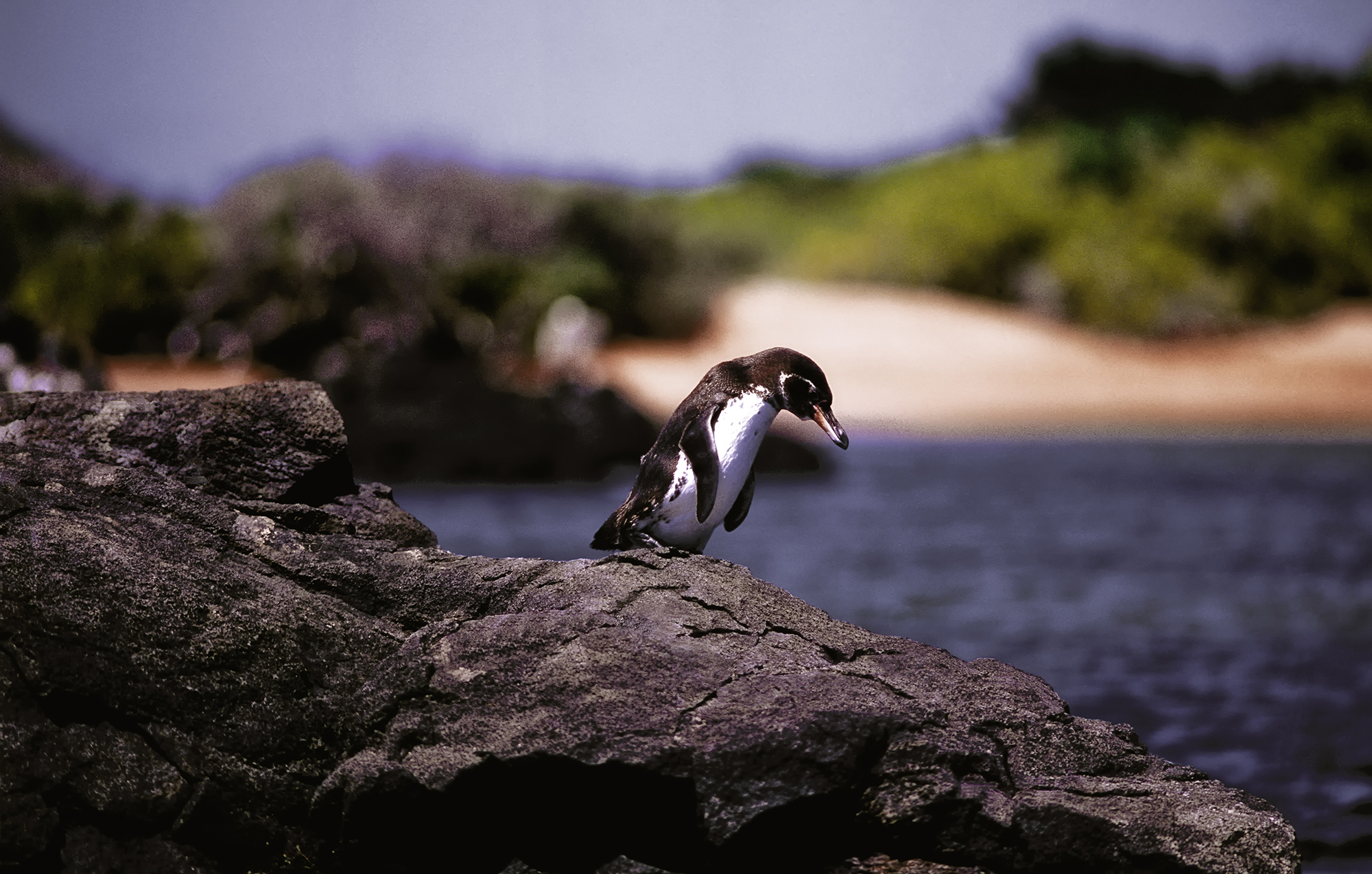 This captivating photograph captures a solitary penguin perched on a rugged, volcanic rock formation, adjacent to a serene body of water. The penguin, with its distinct black and white plumage and subtle reddish hues on its beak, appears to be gazing intently downward, as if contemplating the plunge into the water below or simply immersed in quiet reflection. The composition beautifully balances the detailed texture of the rocky foreground with the soft, blurred backdrop of lush greenery and a sandy shoreline under a clear sky.