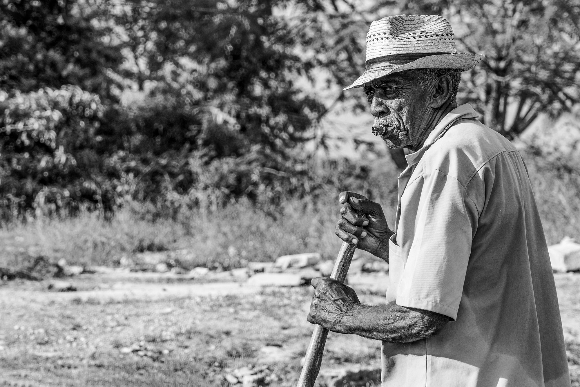 This evocative black-and-white photograph titled Observant captures an elderly man standing outdoors in a rustic, natural setting. Dressed in a light-colored, short-sleeve shirt, the gentleman grips a wooden walking stick firmly with both hands, suggesting reliance on it for support. His posture, slightly turned to the side, reveals a contemplative gaze directed into the distance. A woven straw hat with a dark band shields his head, and a cigar rests between his lips, adding character and an air of quiet resilience to the portrait.