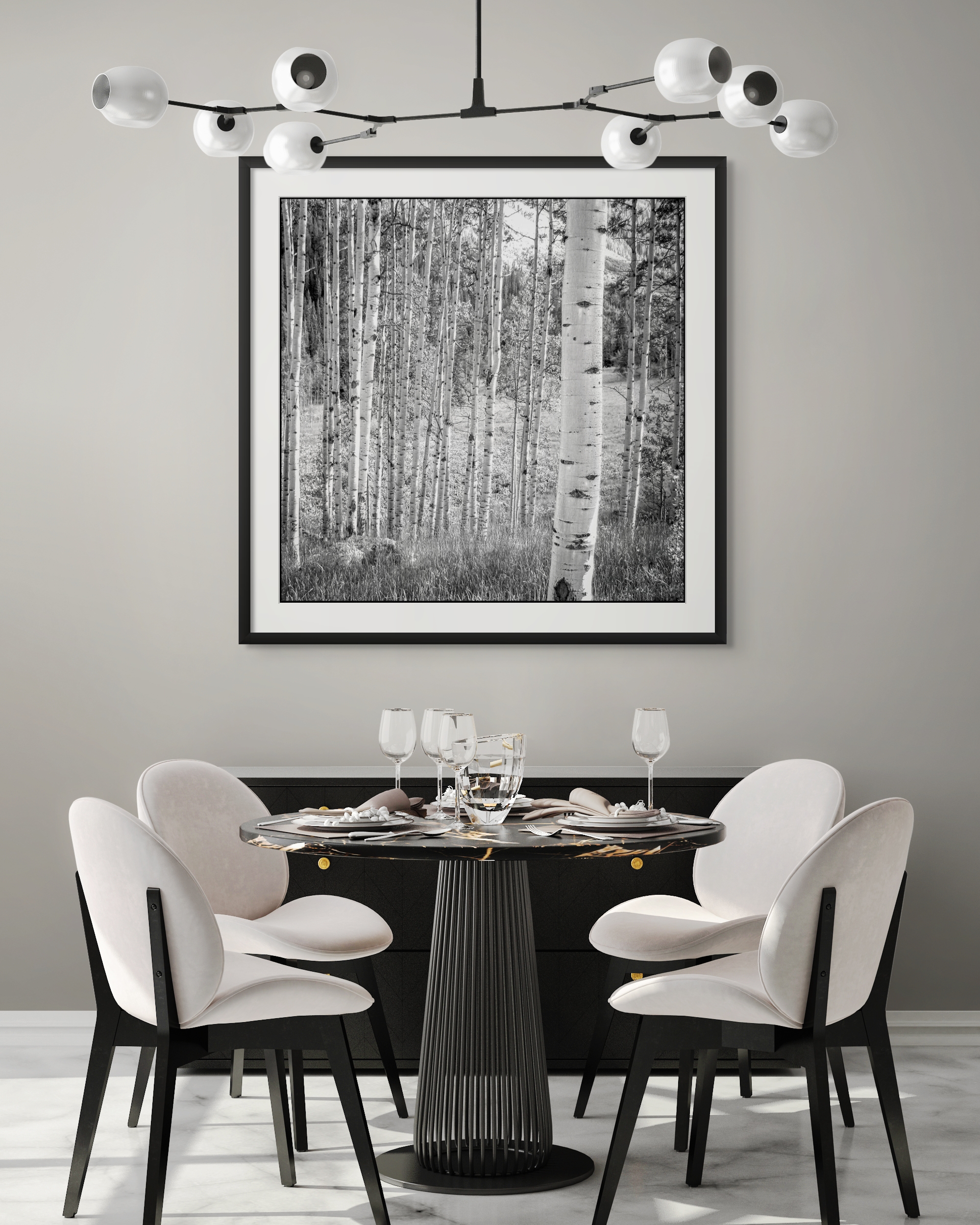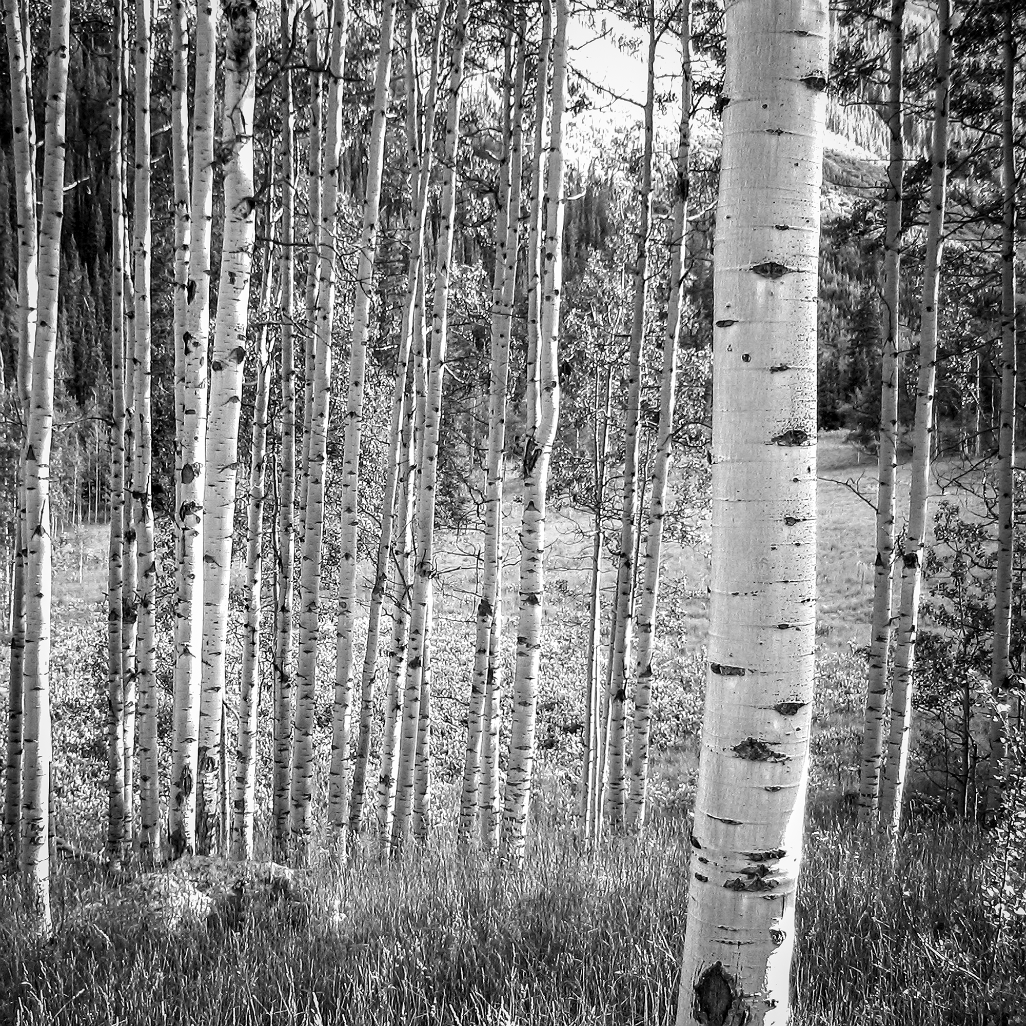 This simple black-and-white photograph captures a serene grove of aspen trees, their tall, slender trunks creating a rhythmic pattern of vertical lines that dominate the composition. The pale bark of the aspens, marked by characteristic dark knots and smooth, peeling textures, contrasts strikingly against the darker, richly textured foliage and underbrush surrounding them. The artist’s choice to remove color focuses the viewer's attention on the intricate interplay of light and shadow that filters through the forest, accentuating the natural patterns and subtle nuances of the bark’s surface.