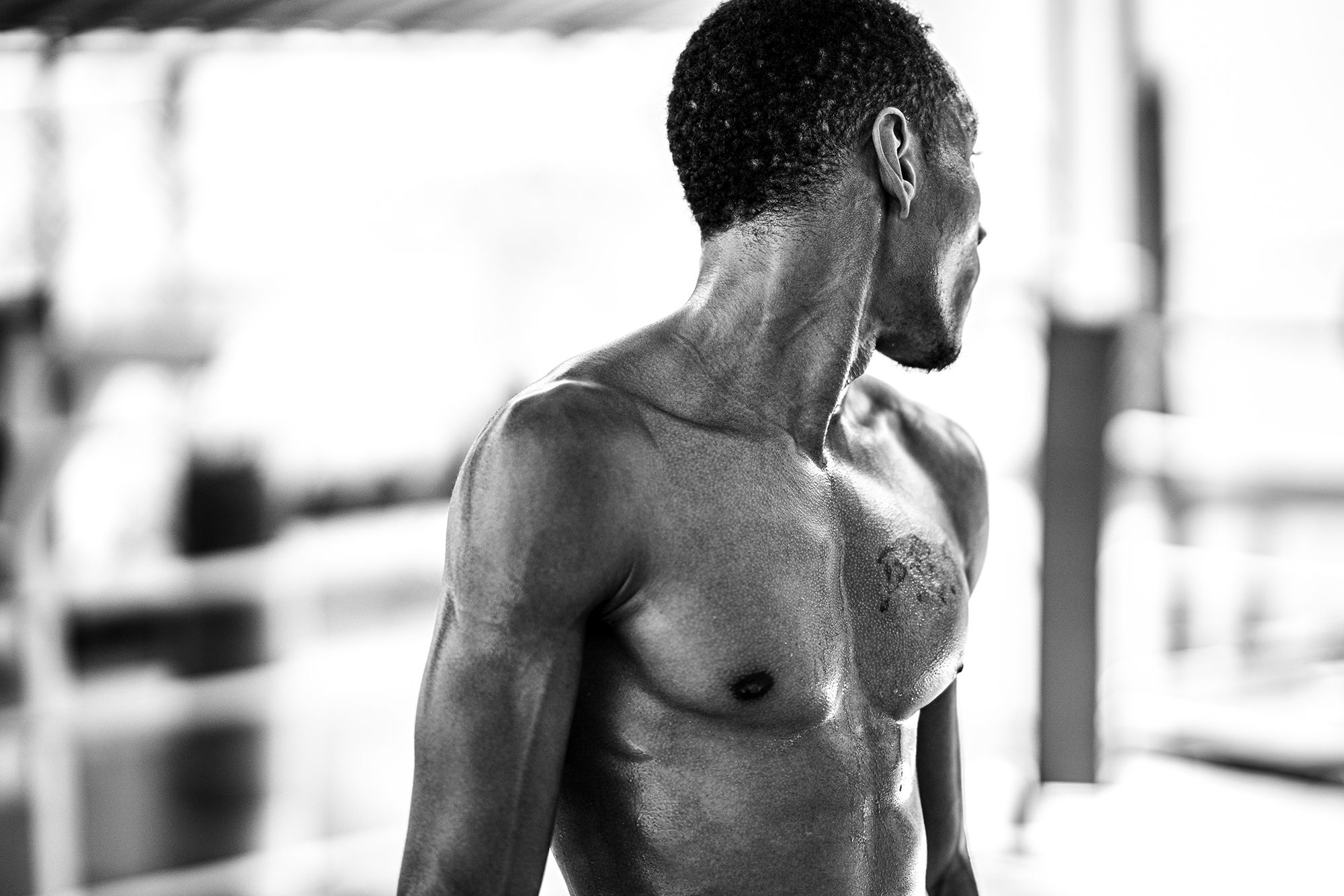 This black-and-white photograph masterfully captures the upper torso and profile of a male figure, turning his face away from the viewer. The image focuses intimately on the detailed textures of his skin and musculature, heightened by the glistening sweat that reflects the ambient light. The sharp contrast in the monochrome palette emphasizes the contours and veins of his neck, shoulders, and chest, suggesting both physical strength and a moment of contemplation or exertion. The background, softly blurred, situates the subject in and indoor boxing gym, though the environment remains abstract enough to keep the emphasis entirely on the human form. The composition’s thoughtful use of light and shadow, combined with the subject’s turned head, evokes a sense of resilience and introspection, inviting viewers to consider the unseen emotions and narratives behind this poised yet vulnerable posture. This piece is a compelling study of the human body in motion and stillness, rendered with artistic sensitivity and technical precision.