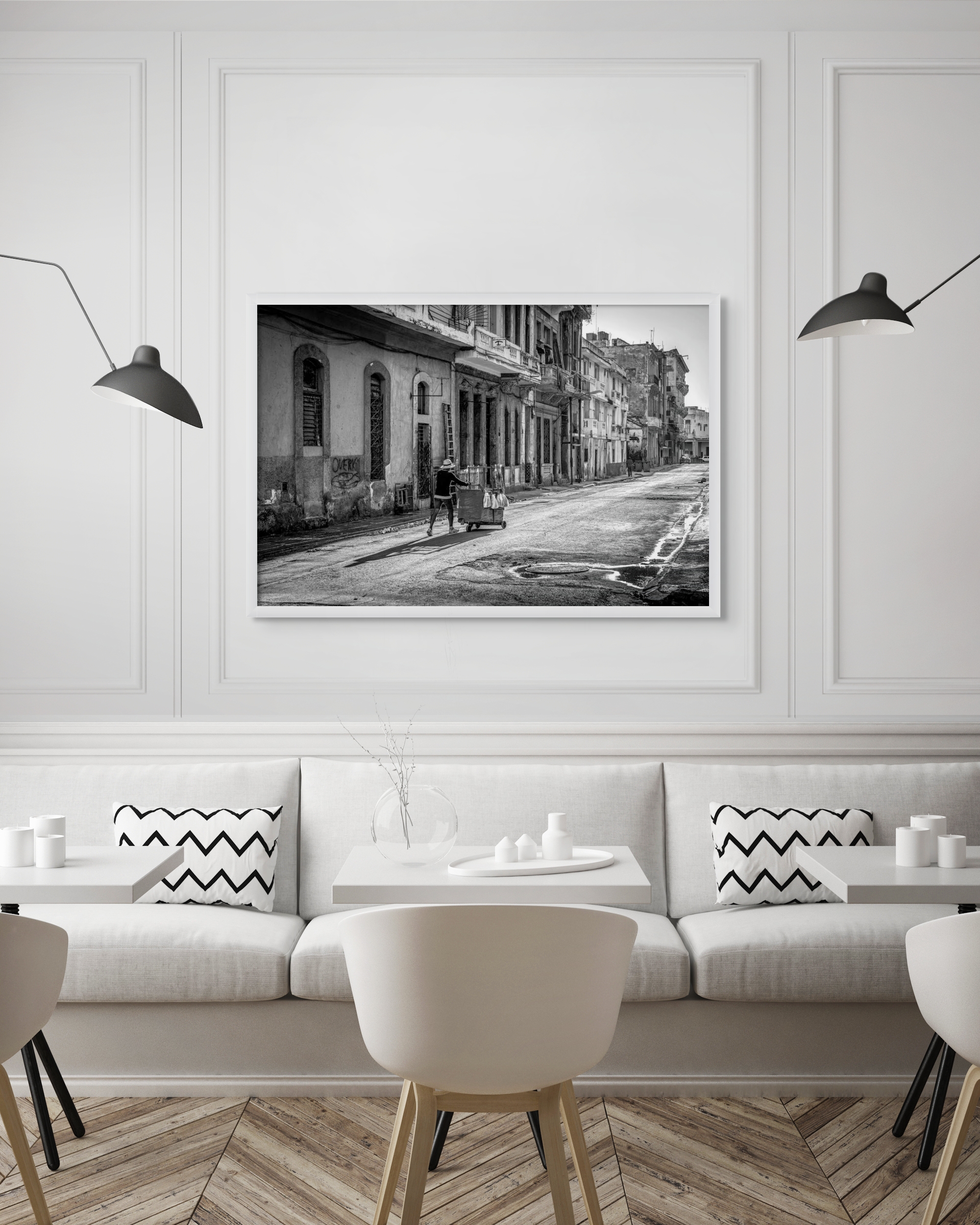 The photograph’s monochromatic treatment intensifies the mood, emphasizing forms, contrasts, and textures rather than color, drawing viewers into a contemplative exploration of place and resilience. The image invites reflection on the everyday realities of urban life, resilience in the face of decay, and the fleeting nature of human presence within the enduring fabric of the cityscape.