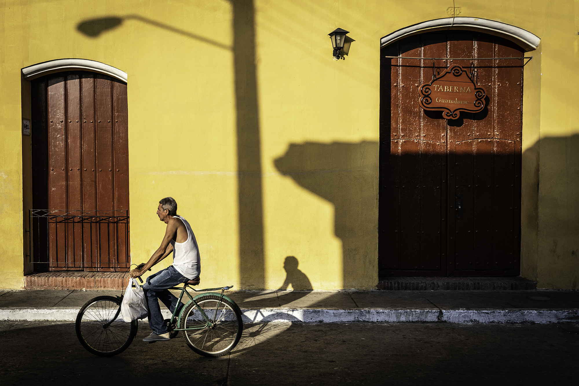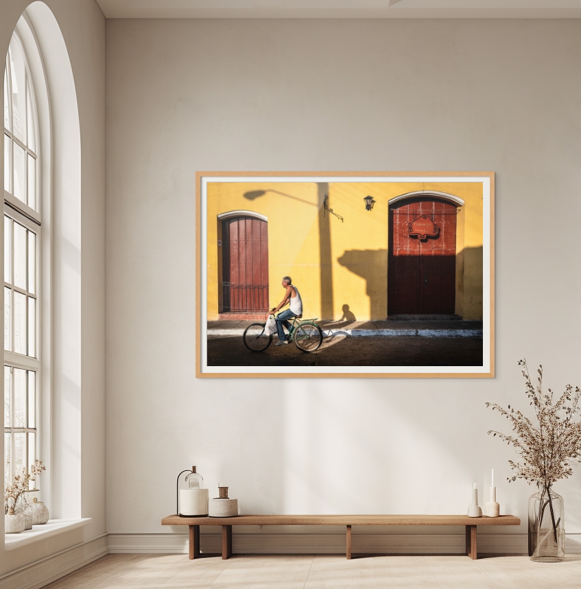 This evocative photograph captures a man riding a bicycle along a sunlit street, framed against a vibrant yellow wall adorned with two large, arched wooden doors painted a deep, rusty red. The composition is a study in contrast and geometric harmony, juxtaposing the organic form of the cyclist with the rigid architectural elements of the building.