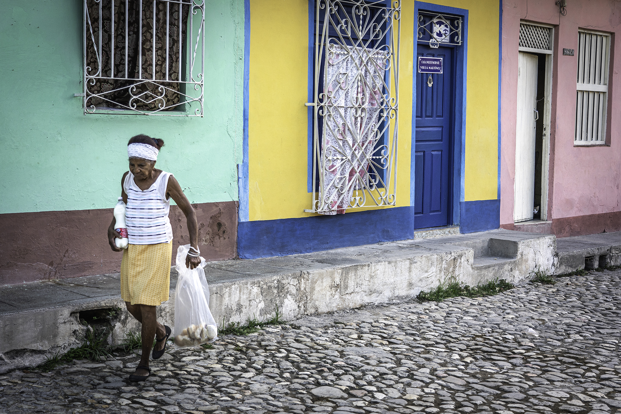 This vibrant photograph captures a slice of everyday life in a picturesque neighborhood setting. An elderly woman walks along the cobblestone path, carrying a plastic bag filled with bread in one hand and a large bottle of milk in the other. Her attire is simple and practical, consisting of a striped sleeveless top, a yellow skirt, and black shoes. A white headband holds her hair back, adding to the simplicity and authenticity of her appearance.