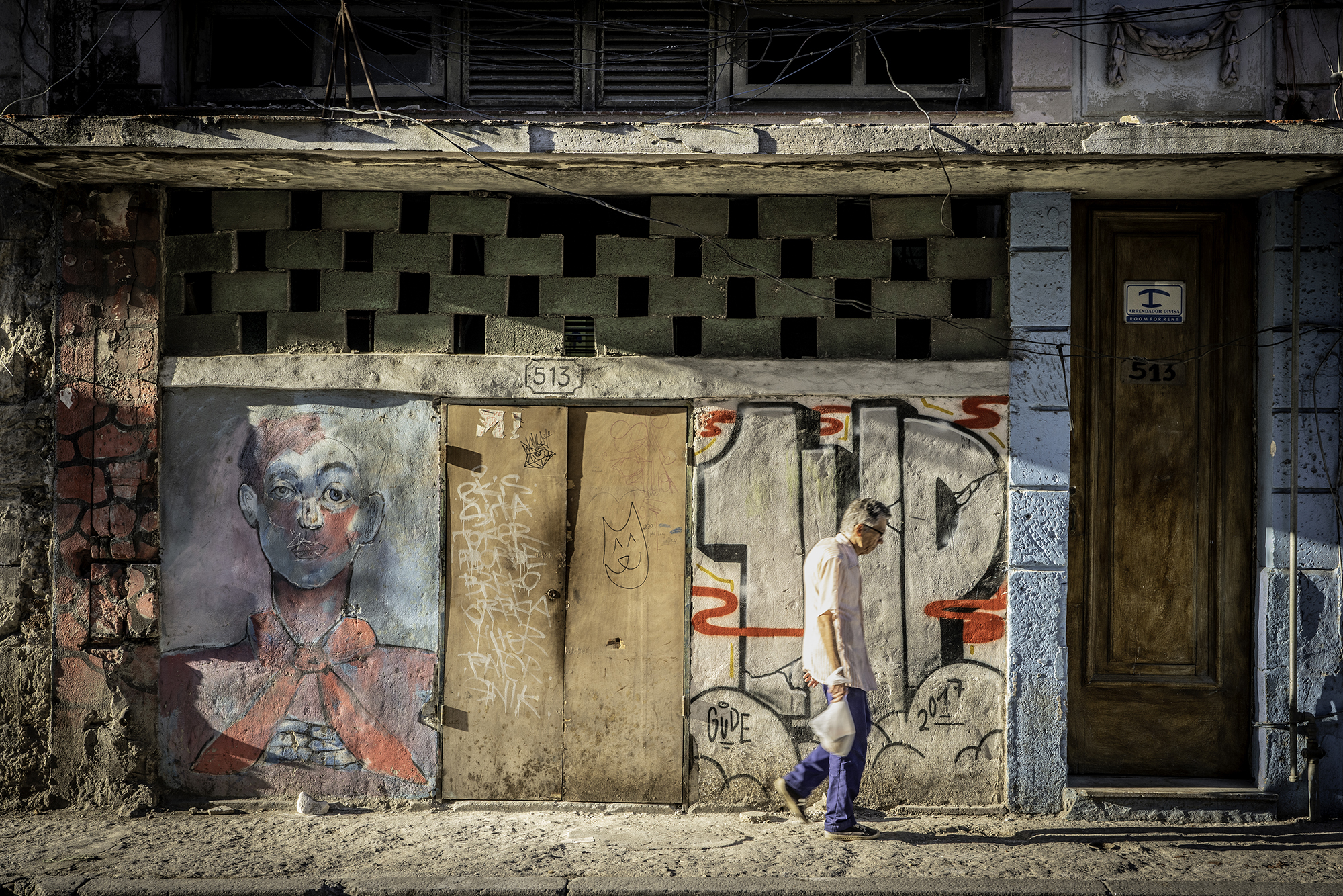 This photograph captures a richly textured urban scene on a dilapidated street, featuring a blend of graffiti art and architectural decay. Occupying the focal point on the left side of the image is a painted mural of a stylized human face set against a rough, concrete wall. The face, with exaggerated features, is adorned in hues of pink, blue, and red, presenting an expression reminiscent of introspective thought or curiosity.