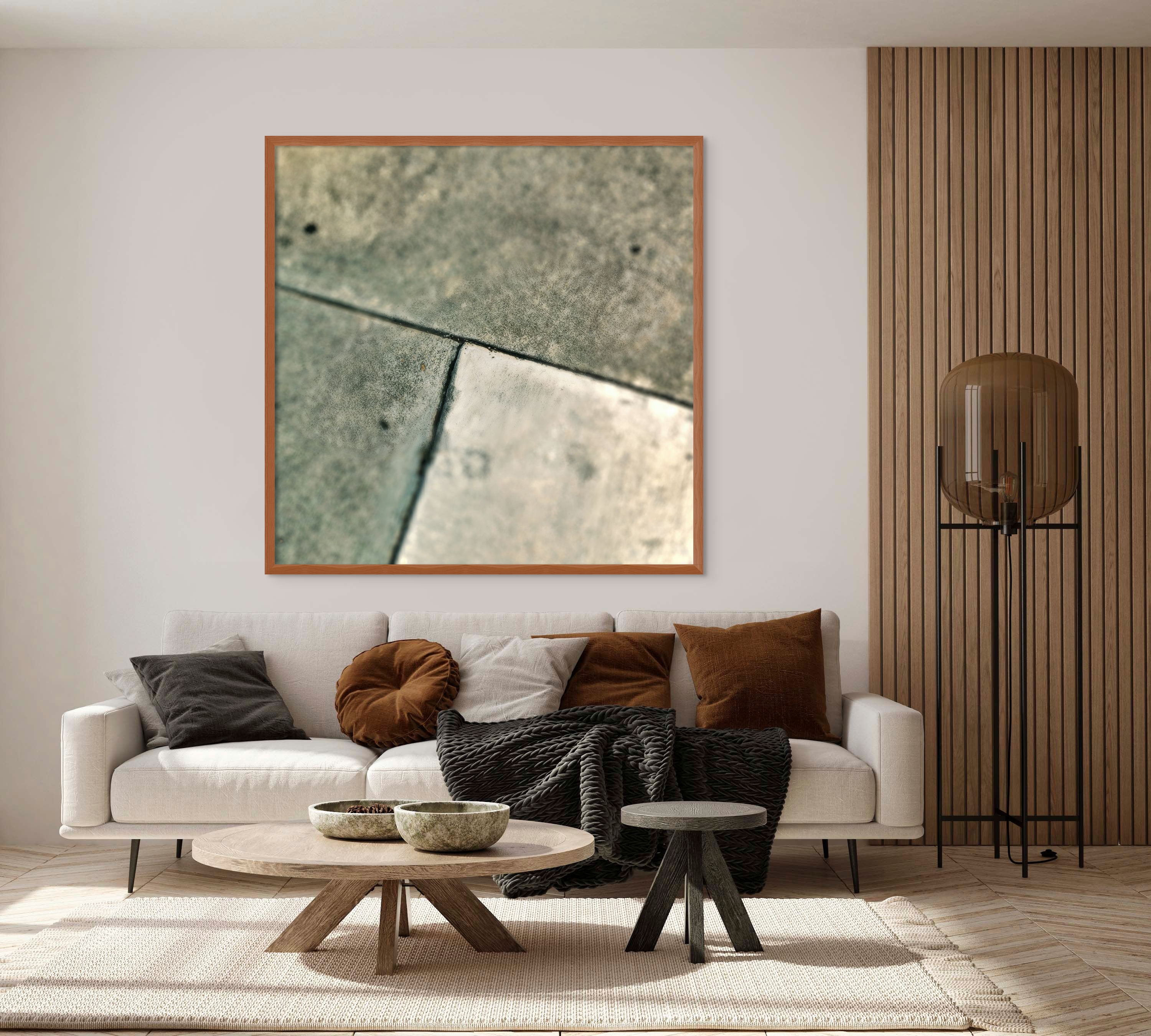 "Intersections in Grey" presents a captivating close-up view of a concrete pavement, capturing the intersection of architectural utility and natural texture. The photograph focuses on the seam where two slabs of concrete meet. Soft hues of gray and beige dominate the piece, highlighting subtle variations and textures unique to weathered stone surfaces.