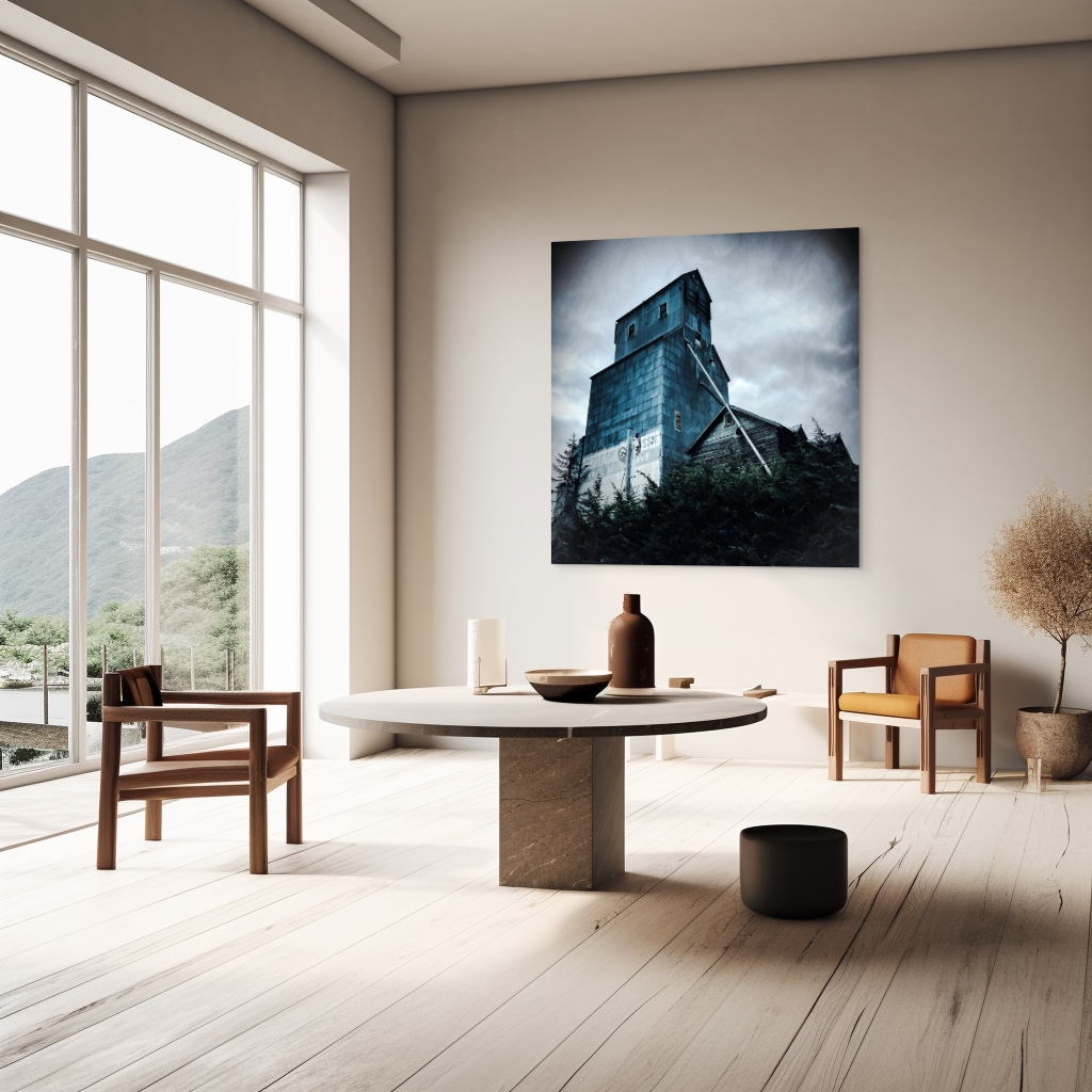 A prominent feature is the tilted metal pipe extending from the upper levels towards the ground, suggesting a past of vibrant agricultural activity. The faint remnants of faded signage can be seen on the façade, whispering stories of its former purpose and the passage of time.